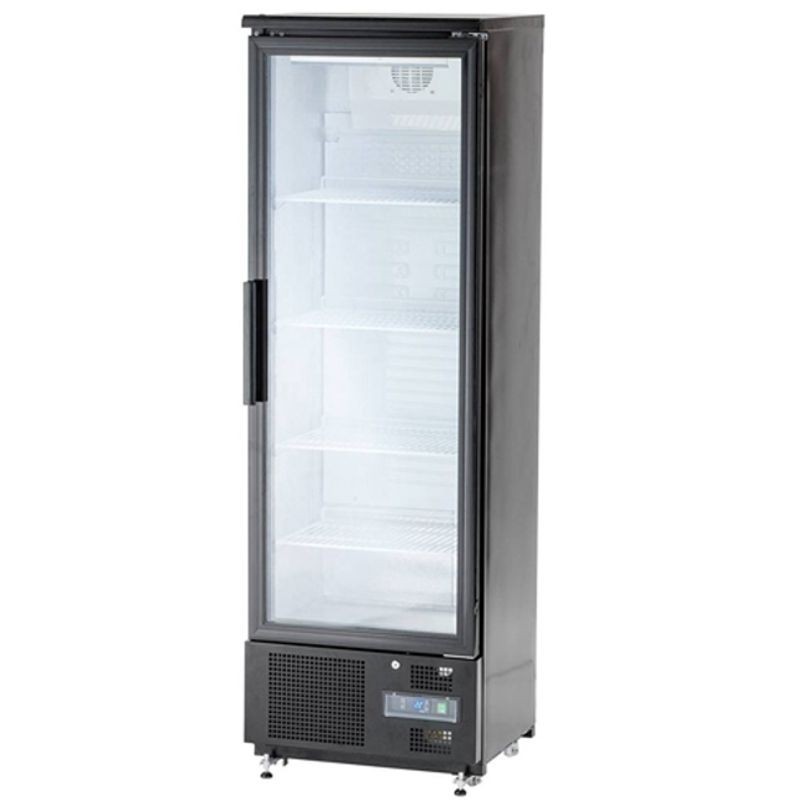 Presklená barová chladnička 1-dverová 307 l - čierne prevedenie, práškové lakovanie, s 1 otváracími dvierkami - teplota 2 /+8 °C, cirkulačné chladenie, digitálny termostat - rozmery: 600 x 520 x 1872 mm, objem: 307 l, výkon: 0,3 kW - 230 V