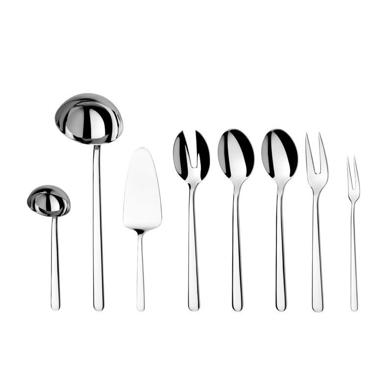 8 dielna súprava prekladcích dielov Beta. Súprava predkladacích dielov 8 dielna obsahuje: 1 x naberačka na polievku (280mm), 1 x predkladacia lyžica (245mm), 1 x predkladacia vidlička (245mm), 1 x lyžička na omáčku (173mm), 1 x lopatka na tortu (224mm), 1 x vidlička na šalát (244mm), 1 x lyžica na šalát (245mm), 1 x vidlička na nárez (201mm).