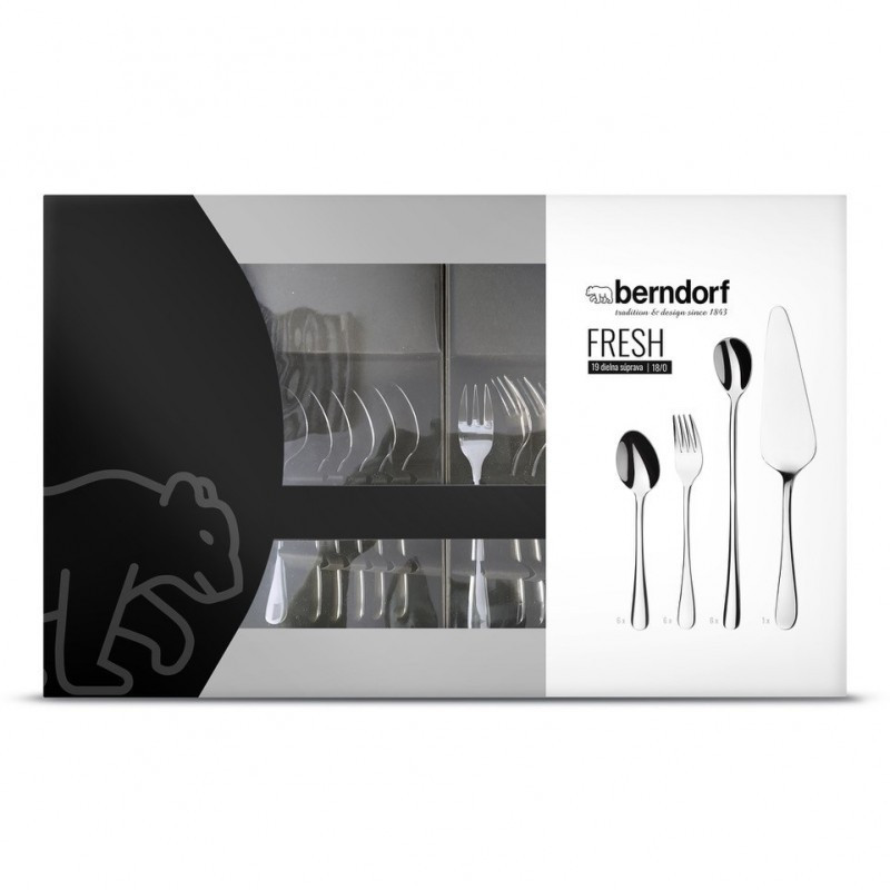 Súprava FRESH 19 dielna. Súprava obsahuje: 6 x lyžička na mokka (115 mm), 6 x vidlička na múčnik (146 mm), 6 x lyžička na limonádu (198 mm), 1 x lopatka na tortu (222 mm).