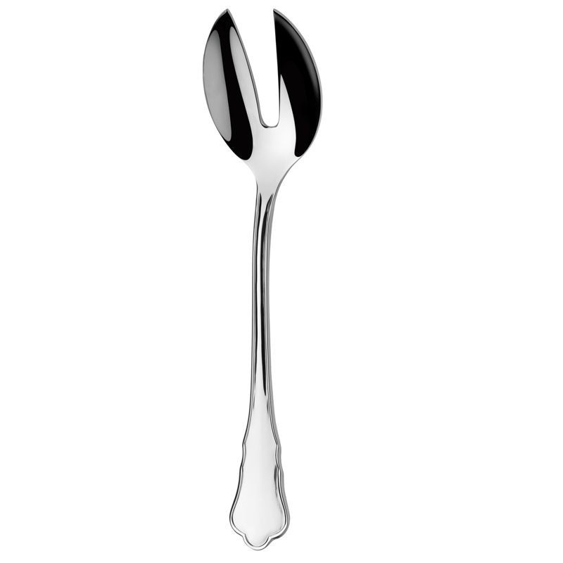Vidlička na šalát Royal Eco. Vidlička na šalát slúži na premiešanie a naberanie čerstvých, väčšinou listových ale aj iných šalátov z misy na tanier. Vidlička predkladacia je rozmerová väčšia ako ostatné vidličky. Vyrobená je z plne recyklovateľnej chrómniklovej ocele pod označením 18/10, ideálnym materiálom pre styk s potravinami. Celková dĺžka 202 mm.