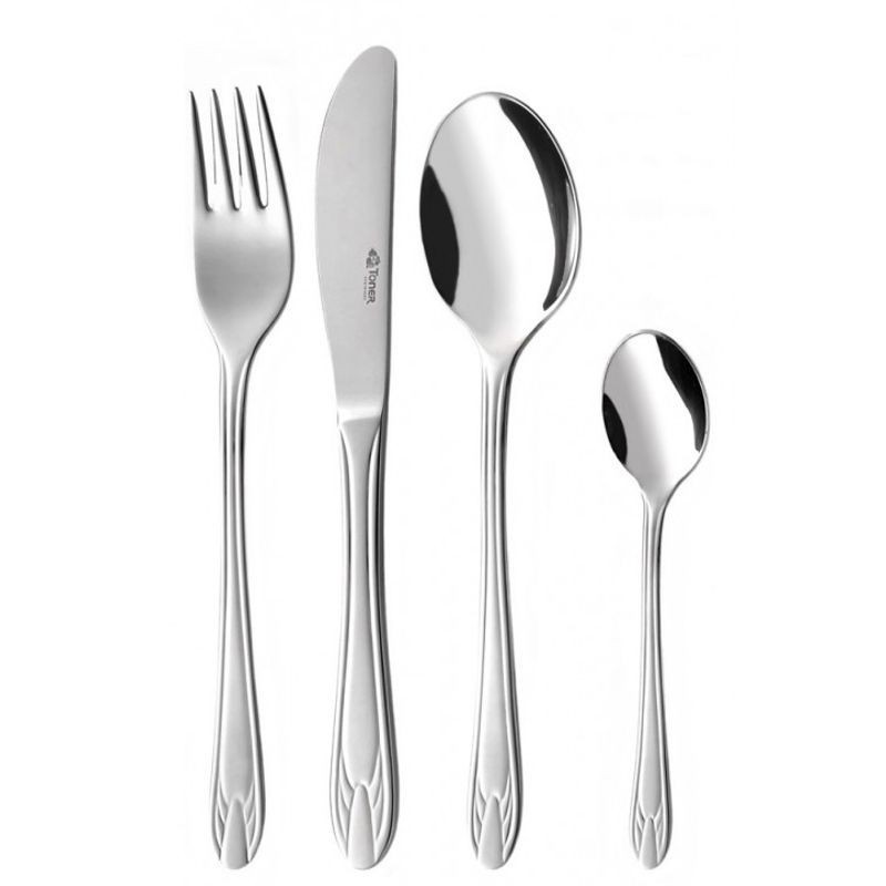 Súprava príboru RUBÍN - 24 dielov. Základný príbor pre 6 osôb v darčekovom balení. Obsah balenia: 6 x lyžica, 6 x vidlička, 6 x nôž, 6 x lyžička na kávu, vhodné do umývačky riadu. Hmotnosť 1593 g, rozmer balenia 280x450x55 mm.