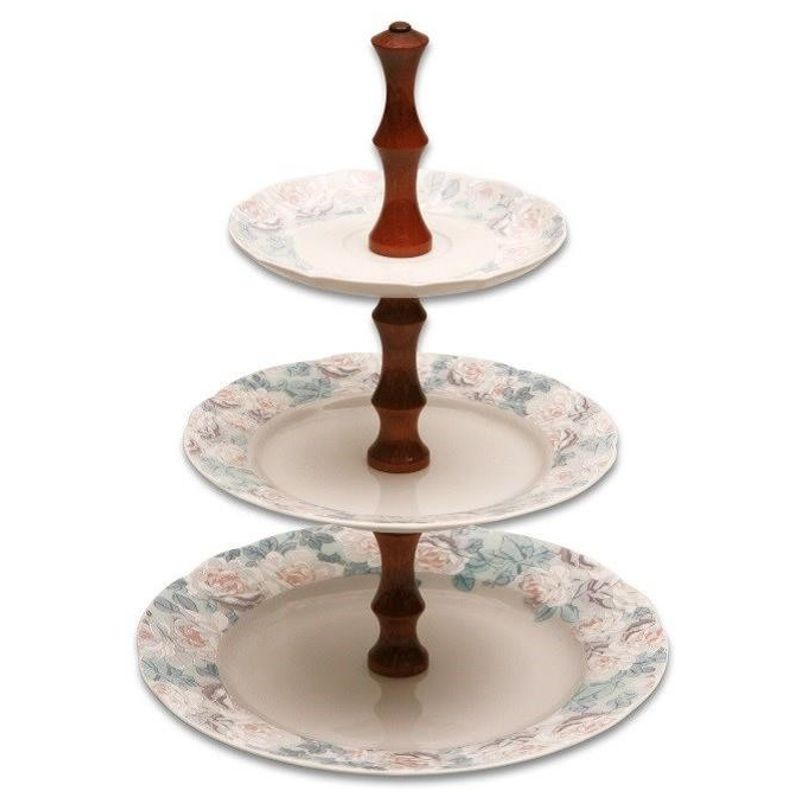Etažerka Rose. Etažerka je trojposchodový tanier doplnený dreveným kľúčom. Vhodná do mikrovlnej rúry a umývačky riadov. Obsahuje: 1x tanier plytký 25 cm, 1x tanier dezertný 19 cm, 1x tanierik podšálka 15 cm. Váha:1,100 kg