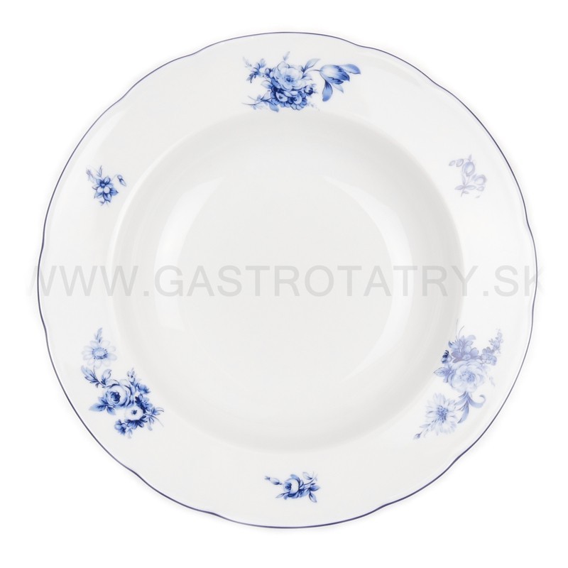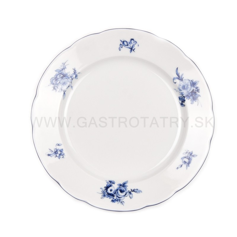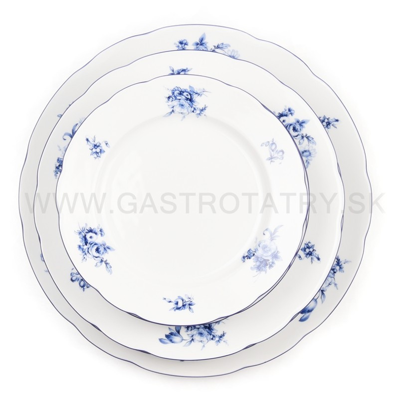 Rose modrý kvet + modrá linka tanierová súprava 18 D. Je vhodná do umývačky riadu aj do mikrovlnnej rúry.