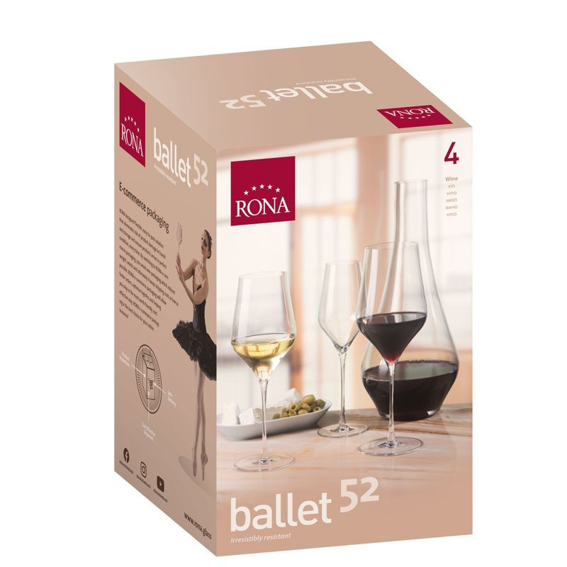Pohár BALLET víno 520 ml. Baletka je zosobnením krásy, pevnosti a pružnosti. Práve ňou sa inšpiroval nový súbor BALLET značky RONA. Neodolateľne odolná! Toto sú znaky kvality línie Ballet: jemnosť a elegancia, štíhla noha kalichov, ťahaná noha - z jedného kusu skla = odolnosť, pevná základňa (dienko) podľa presných technických parametrov, moderný zúžený spodný tvar kalicha do "V", nové "e-commerce" balenie pre bezpečné zasielanie