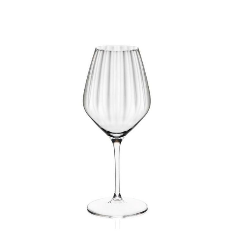 Kalich Wine 360 ml OPTICAL. Rona Select je sklo pre široké použitie od ochutnávky vín a degustácie nápojov, po bežné domáce účely. Verzia OPTICAL ponúka pútavú reliéfnu štruktúru, ktorá dodáva sklu optickú elasticitu a lepšie prevzdušňuje a otvára víno. Klasický tulipánový tvar kalichov zvýrazňuje vôňu a farbu červeného a bieleho vína. Dizajn vhodný do všetkých typov interiérov. OPTICAL udržiava retro módu na vyššej úrovni. Okrem vínových kalichov v 4 objemoch a pohárov v 2 veľkostiach, sú novými členmi kolekcie aj 2 vázy.