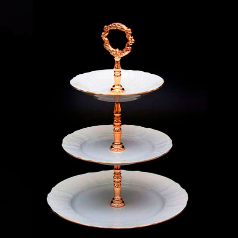 Karlovarský porcelán - Etažérka Bernadotte biela 3D zlatá linka. Tento porcelán nie je vhodný do mikrovlnnej rúry ani do umývačky riadu.