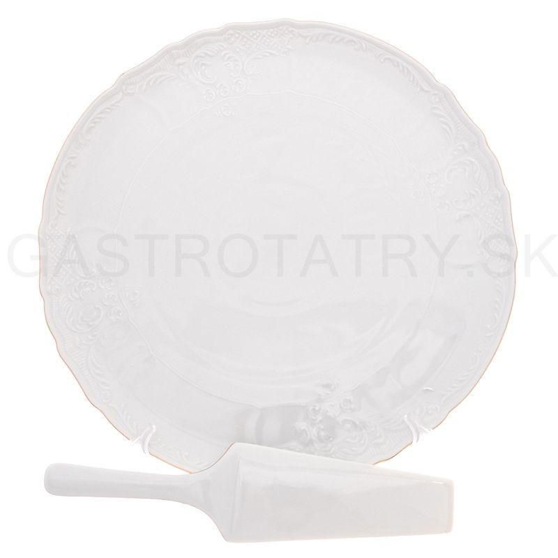 Karlovarský porcelán - Tortový tanier 32 Bernadotte biely zlatá linka. Je nevhodný do umývačky riadu aj do mikrovlnnej rúry.