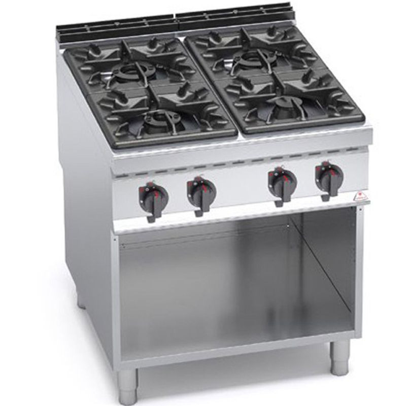 4- Plynový sporák BERTO´s ▪ s výkonnými horákmi 3,5kW, 7kW alebo 12 kW ▪ s pilotným plameňom ▪ veľmi jednoduché čistenie vďaka jednoducho vyberateľným horákom a odnímateľným vaničkám pod horákmi ▪ na zemný plyn (trysky na propán-bután pribalené) ▪ dodávané bez dvierok, možné doobjednať ▪ dostupné aj v tálovom prevedení ▪ so zárukou 3 roky na náhradné diely. Rozmery 800 x 900 x 900 mm, 4 horáky, výkon horákov plyn 3,5/7/2x 12 kW, výkon sporáku plyn 34,5 kW, prípojka plyn G20