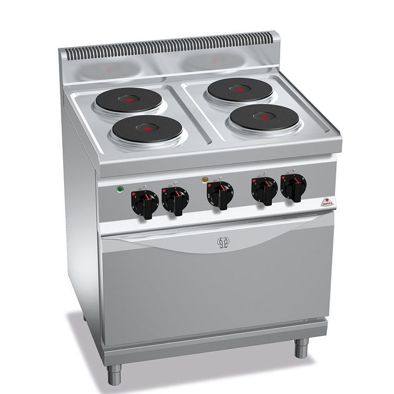 4- elekrický sporák s elekrickou rúrou BERTO´s rada 700 ▪ elektrické sporáky sú vybavené štyrmi okrúhlymi platňami priemeru 220 mm ▪ varné platne s výkonom 2,6 kW ▪ statická rúra GN 2/1 (kapacita 4 x 650 x 530 mm) ▪ so zárukou 3 roky na náhradné diely. Rozmery 800 x 714 x 900 mm, počet platní a výkon 4x 2,6 kW, prípojka 400 V, príkon 17,9 kW