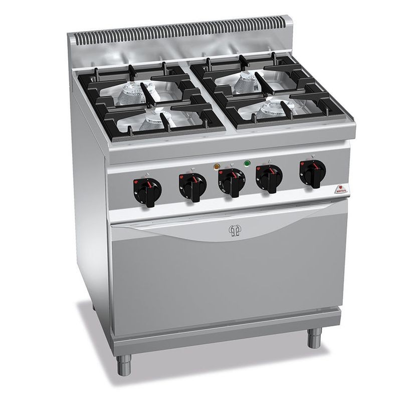 4- P-sporák s elekrickou rúrou BERTO´s rada 700 ▪ sporáky sú vybavené výkonnými horákmi s pilotným plameňom ▪ na zemný plyn (trysky na propán-bután pribalené) ▪ veľmi jednoduché čistenie vďaka jednoducho vyberateľným horákom a odnímateľným vaničkám pod horákmi ▪ statická rúra GN 2/1 (kapacita 4 x 650 x 530 mm) ▪ so zárukou 3 roky na náhradné diely. Rozmery 800 x 714 x 900 mm, výkon horákov plyn 800 x 714 x 900 kW, výkon plyn 21 kW, prípojka plyn G20, prípojka el. rúry 400 V, rpíkon el. rúry 7,5 kW