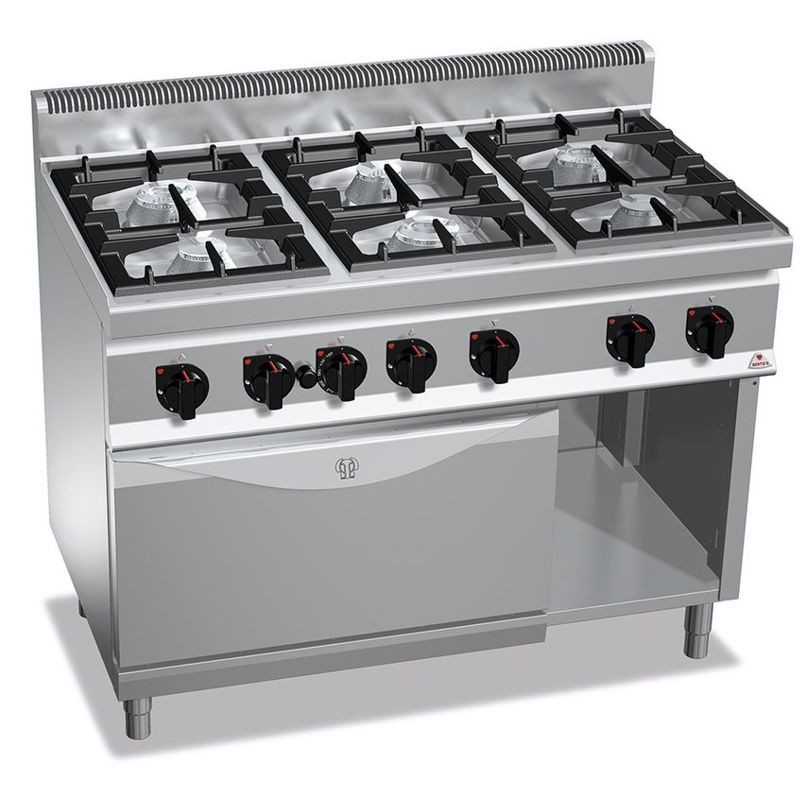 6- P-sporák s plynovou rúrou BERTO´s rada 700 ▪ sporáky sú vybavené výkonnými horákmi s pilotným plameňom ▪ na zemný plyn (trysky na propán-bután pribalené) ▪ veľmi jednoduché čistenie vďaka jednoducho vyberateľným horákom a odnímateľným vaničkám pod horákmi ▪ statická rúra GN 2/1 (kapacita 4 x 650 x 530 mm) ▪ dostupné aj v tálovom prevedení, s extra veľkou rúrou ▪ so zárukou 3 roky na náhradné diely. Rozmery 1200 x 714 x 900 mm, výkon horákov plyn 3x 3,5 / 3x 7 kW, výkon sporáku 39,3 kW, výkon rúry plyn 7,8 kW, prípojka plyn G20