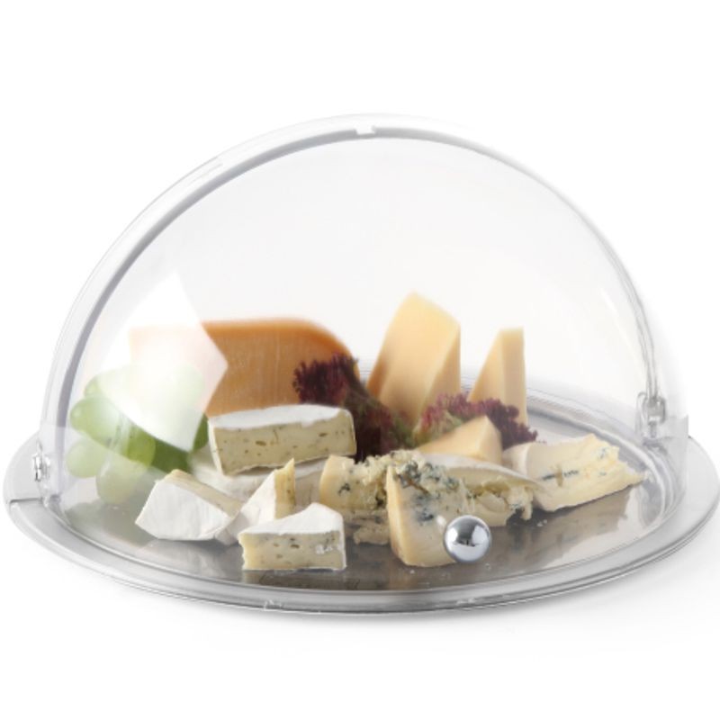 Okrúhly roll-top kryt, ⌀380 x výška 200 mm. Priehľadný kryt vyrobený zo SAN, otvorený jednostranne do 90°. S chrómovým tlačidlom. Vhodné pre okrúhly displej s roll-top krytom, tiež k dispozícii v tejto sade (kód: 424001).