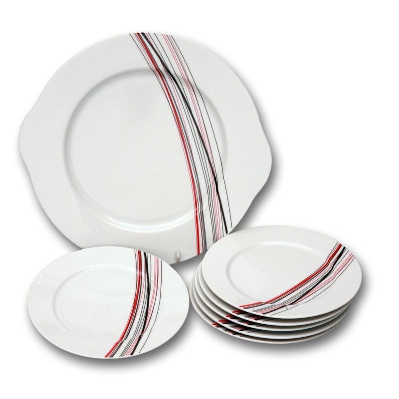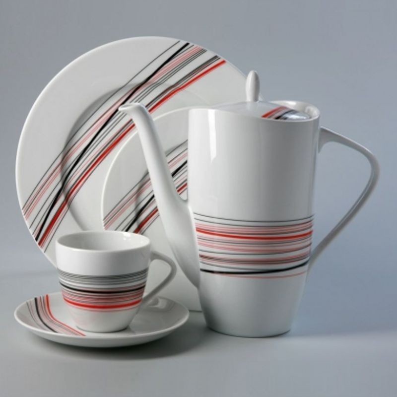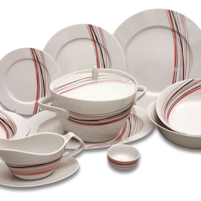 Karlovarský porcelán - Sylvie obedová súprava s prúžkami 27 D, farby prúžkov červená, čierna a sivá farba. Je vhodná do mikrovlnej rúry a umývačky riadu.