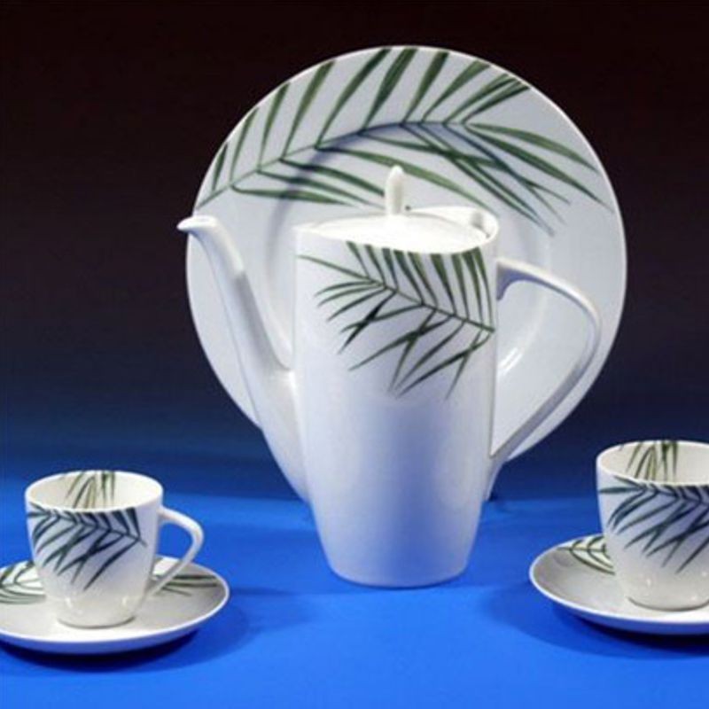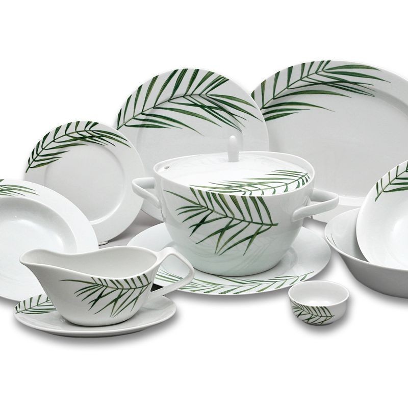 Karlovarský porcelán - Sylvie obedová súprava s palmovými listami 27 D. Je vhodná do mikrovlnej rúry a umývačky riadu.