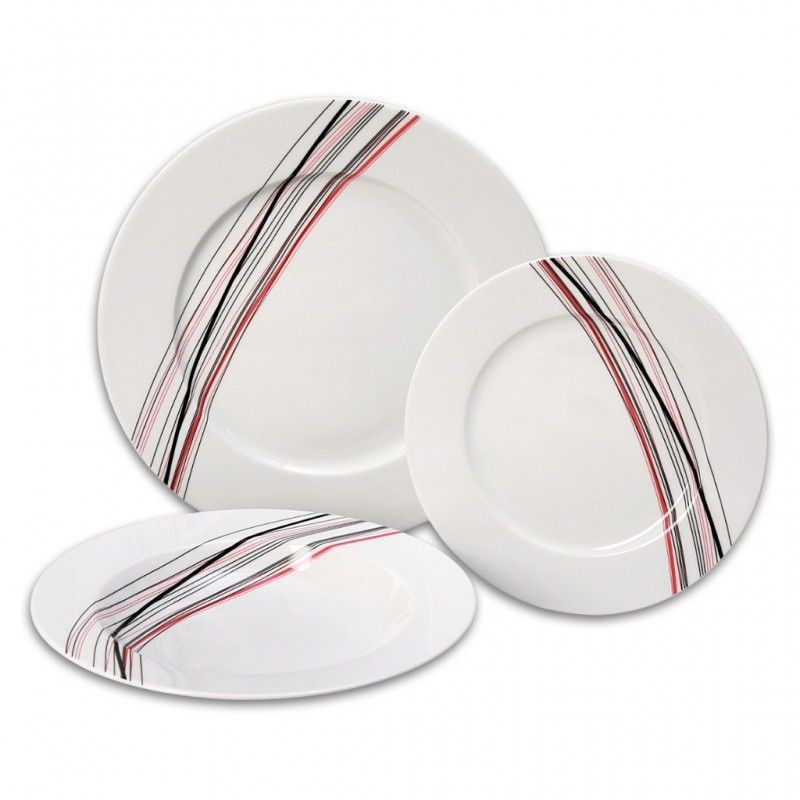 Tanierová súprava 18 dielna Sylvie (Jana) čierno-červené pruhy. Obsahuje: 6 x tanier plytký 25 cm, 6 x tanier hlboký 22 cm, 6 x tanier dezertný 19 cm