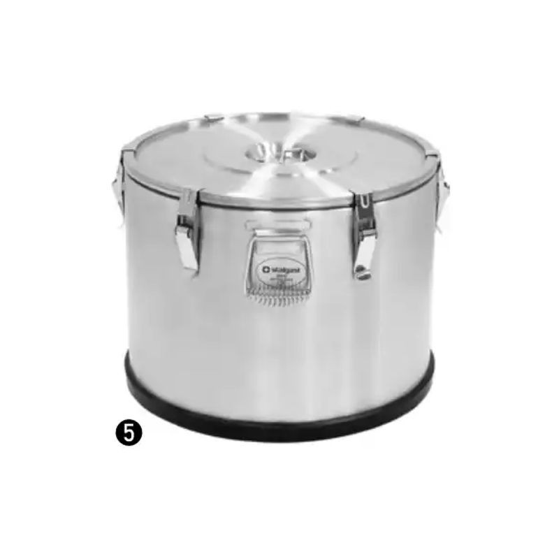 Termoizolačná nádoba z nerezu, pokrievka so silikonovým tesnením, hrubá penová izolácia, dvojité steny, dno aj pokrievka, 6 izolačných uzáverov pokrievky, podstava z elastického materiálu, chráni pred mechanickým poškodením a umožňuje skladanie termonádob na seba, tlakový ventil pre ľahké otváranie nádoby, bez výpustu.