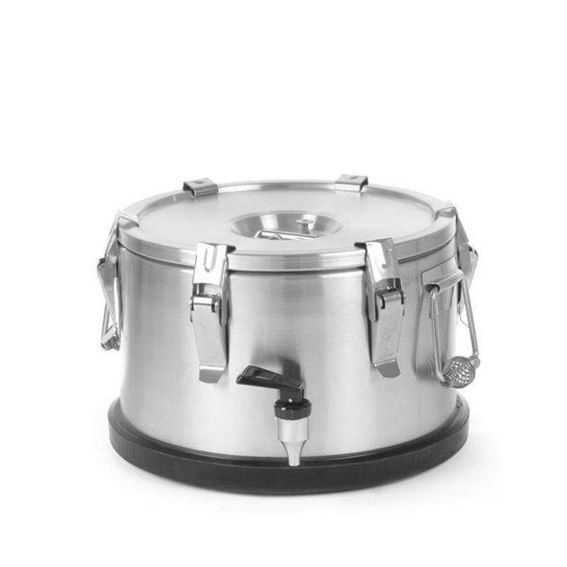 Termoska Profi Line s kohútikom, objem 10 l, priemer 330 mm, výška 220 mm. Určená pre cateringové firmy na udržiavanie tepla prevážaných pokrmov a kvapalín