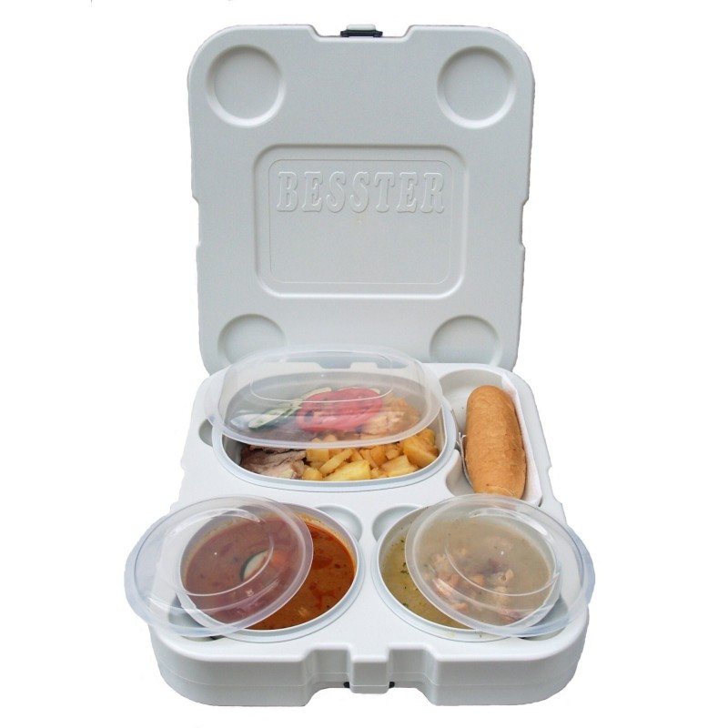 Tablet - TERMOKAZETA /TŠ, - na prenos jedla, rozmer: 35x40x12,3 cm, termoizolačná vložka, obsah: 2 x miska priemer 15,5 cm/0,5 l + viečko, 1 x miska oválna 23, 5x18 cm/1 l + viečko, odporúčaná max. teplota pri umývaní obalu termoboxu v umývačkách riadu 70°C, odporúčaná teplota pre vkladaný obsah min. 80°C, hmotnosť 1,73 kg Popruh upínací univerzálny na zopnutie 2 – 4 ks termobox BESSTER nie je súčasťou termoboxu, je možné si dokúpiť TU.