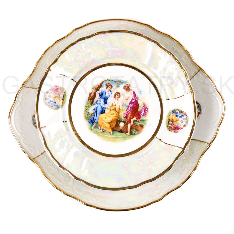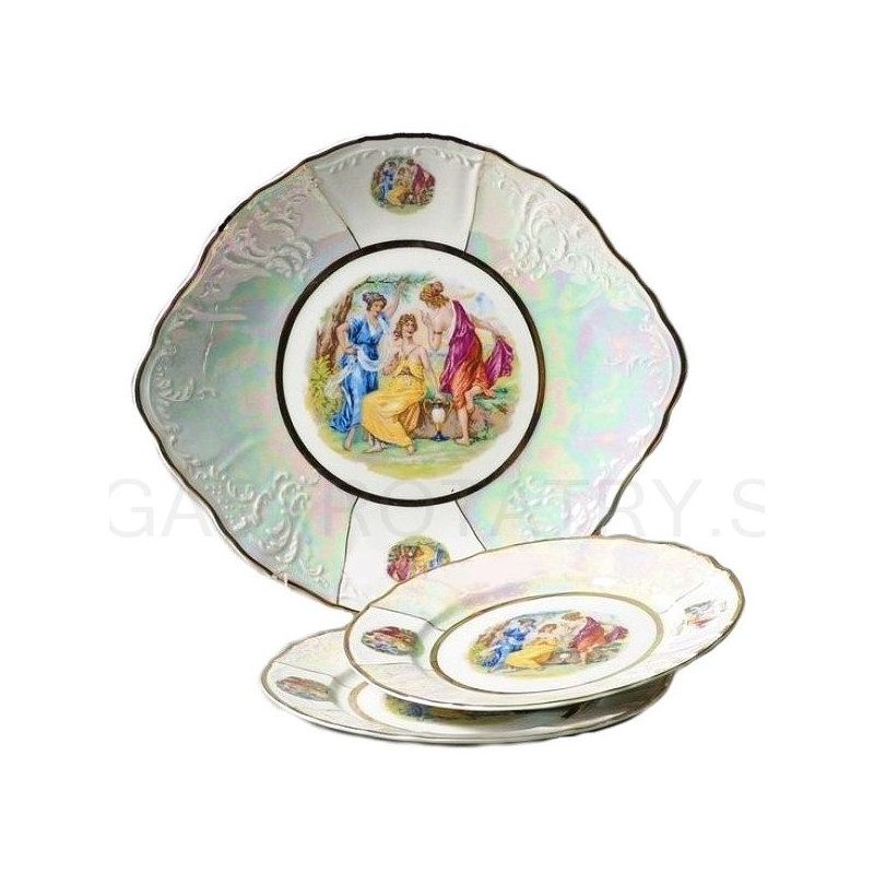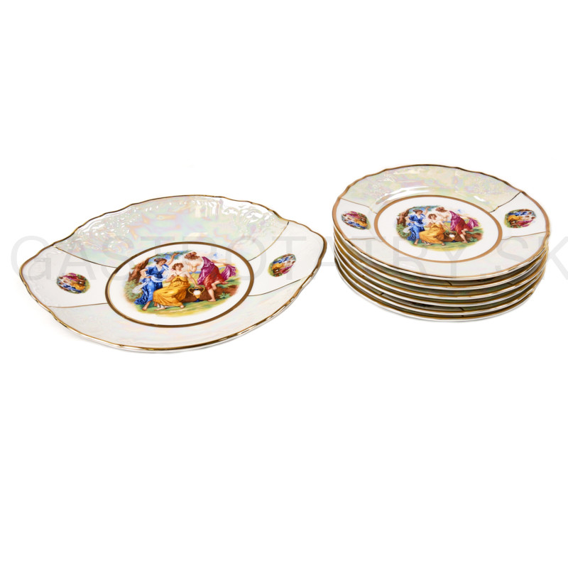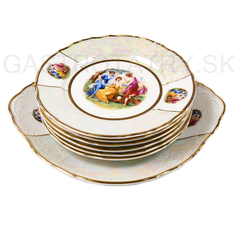 Karlovarský porcelán Bernadotte - Koláčová súprava Tri Gracie Lister a zlatá linka 7 dielna. Koláčová súprava je vhodná do mikrovlnnej rúry a umývačky riadu. Obsahuje: 1 x tanier koláčový 27 cm, 6 x tanier dezertný 19 cm