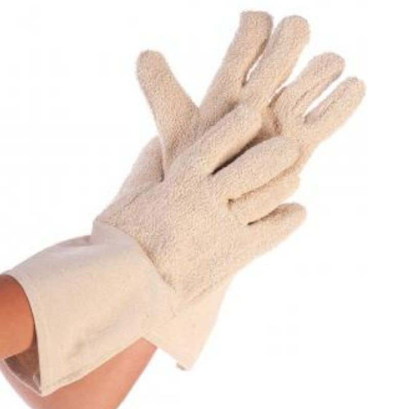 Rukavice pekárske prstové. Teplu vzdorné rukavice prstové vhodné pri pekárskych a kuchárskych prácach. Materiál: froté - bavlna. Pranie: 40°C. Univerzálna veľkosť. Použitie pri pečení, varení a pod. Cena je za 1 pár. (3311)