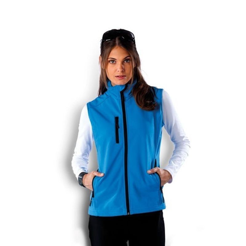 Dámska strečová, softshellová vesta. 3-vrstvový priedušný materiál, vode odolná, dve bočné vrecká a jedno náprsné, vnútro vystlané flisom. Materiál:95%polyester 5% elastan (300g/m2) (Kariban K404).