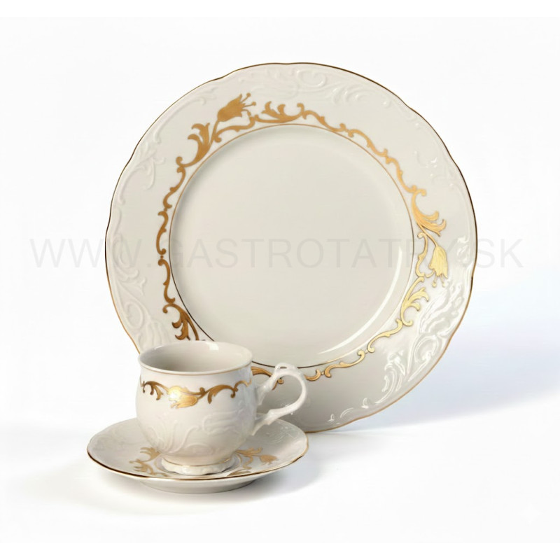 Karlovarský porcelán Tulip - zlatý ornament, 17-dielna čajová súprava, reliéfny povrch, zvlnené okraje, precízne vypracovanie, výrazné ušká a úchytky. Obedová súprava nie je vhodná do mikrovlnej rúry a umývačky riadu.