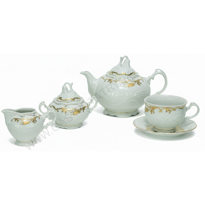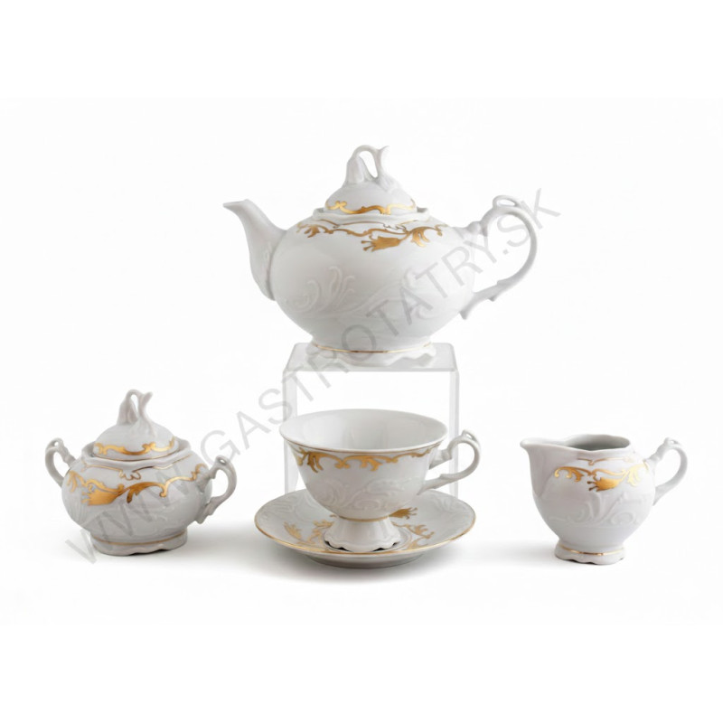 Obsahuje: 6 x šálka nízka na nôžke 165 mm, 6 x tanierik 160 mm, 1 x kanvica čajová s viečkom 1,10 l, 1 x mliekovka vysoká 0,20 l, 1 x cukornička s viečkom 0,24 l