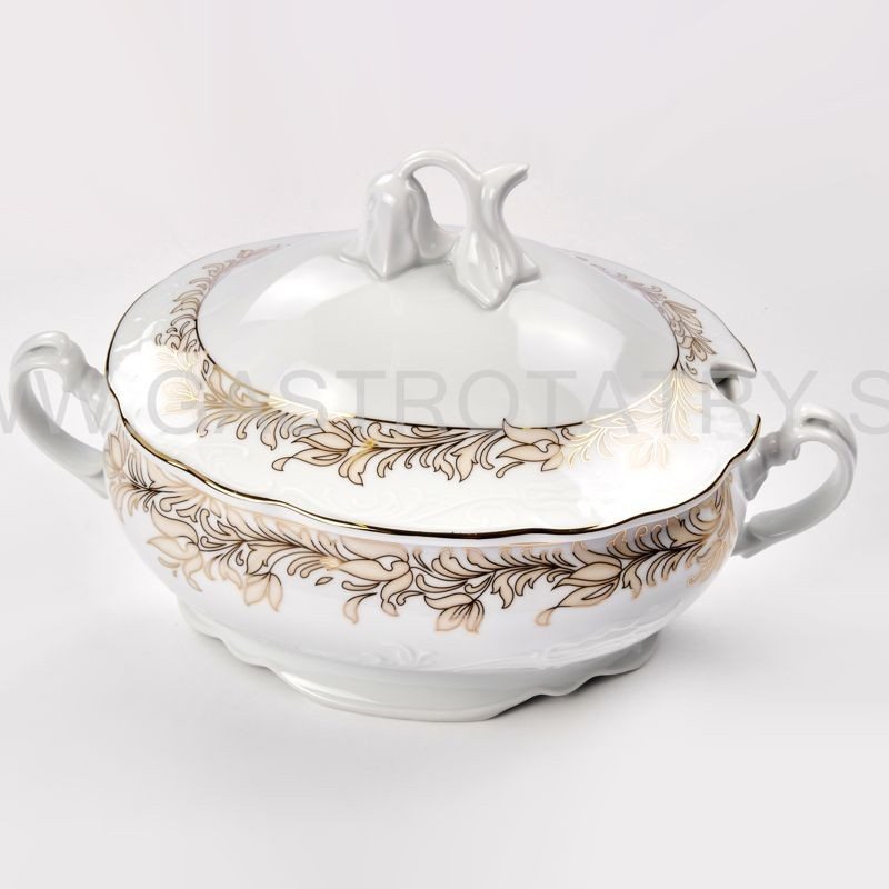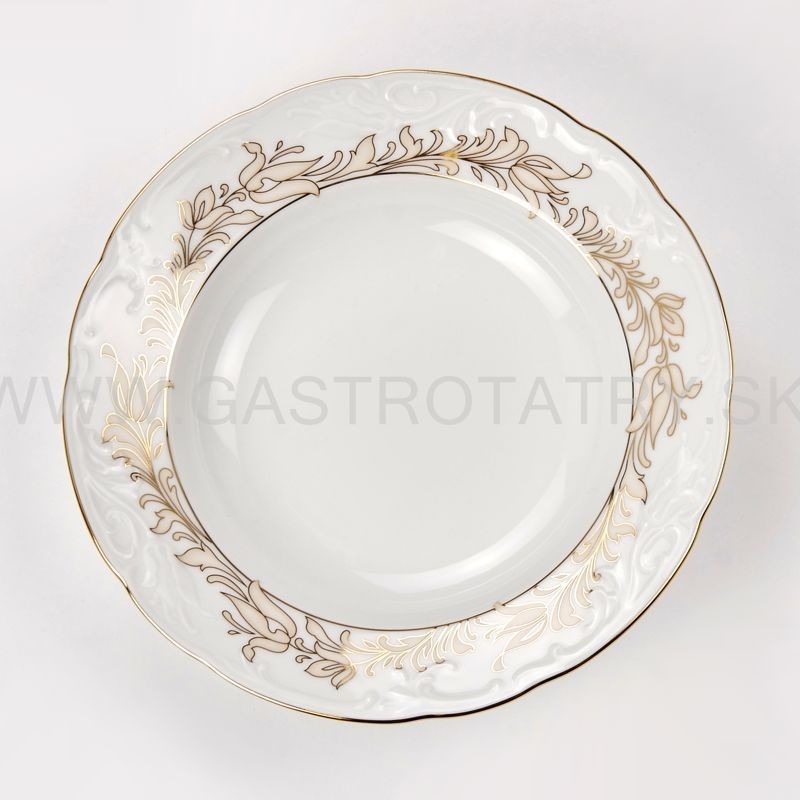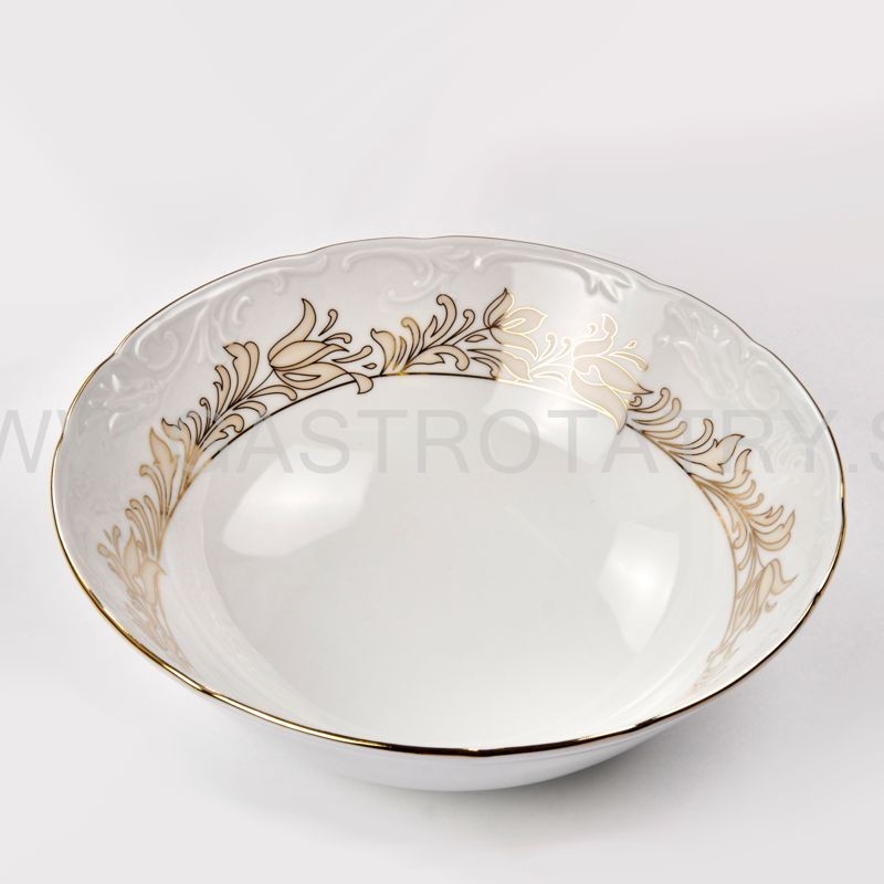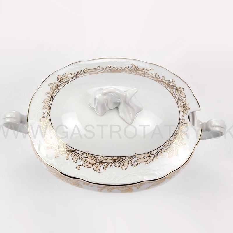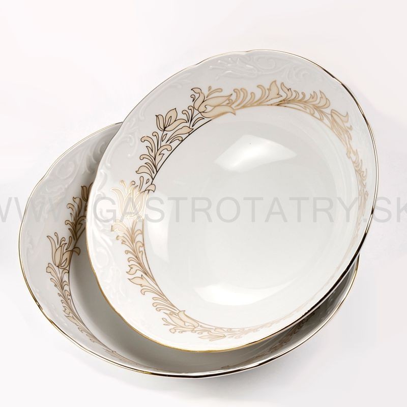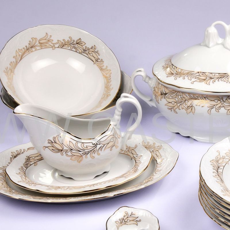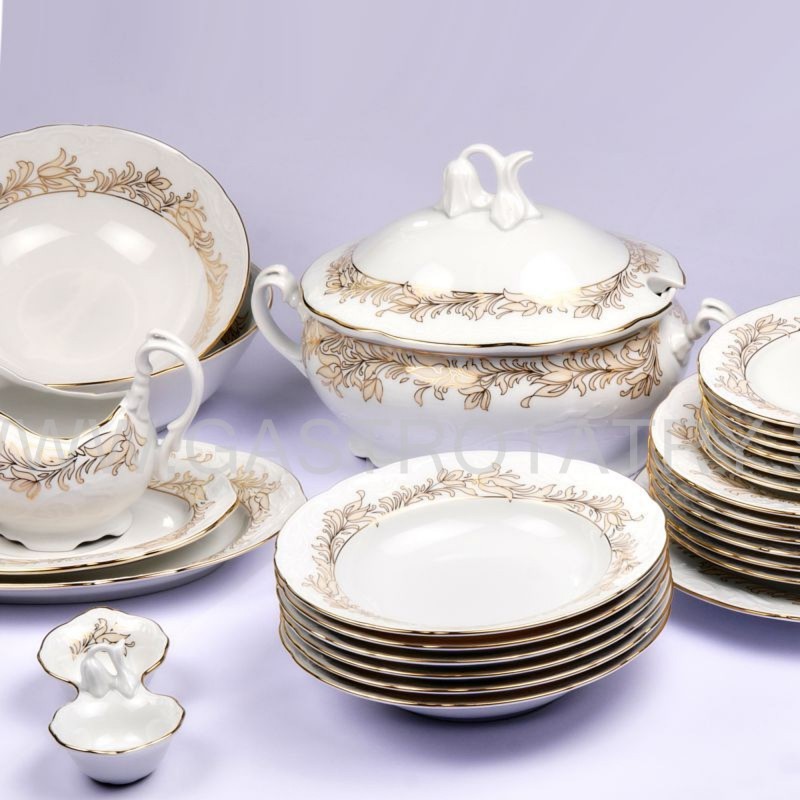 Karlovarský porcelán Tulip - jemný ornament - zlatá linka, 25-dielna, reliéfny povrch, zvlnené okraje, precízne vypracovanie, výrazné ušká a úchytky. Obedová súprava nie je vhodná do mikrovlnej rúry a umývačky riadu.