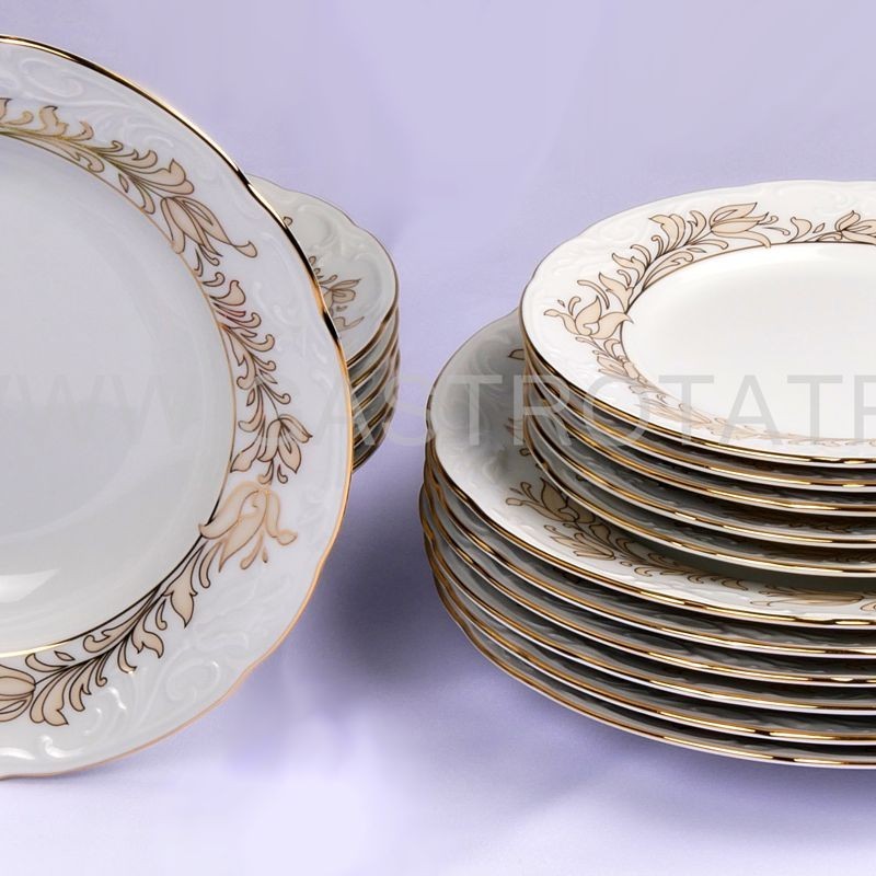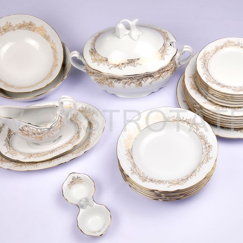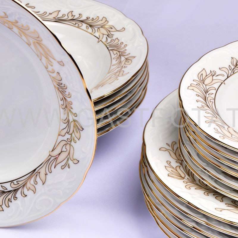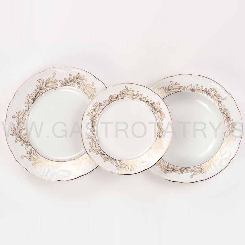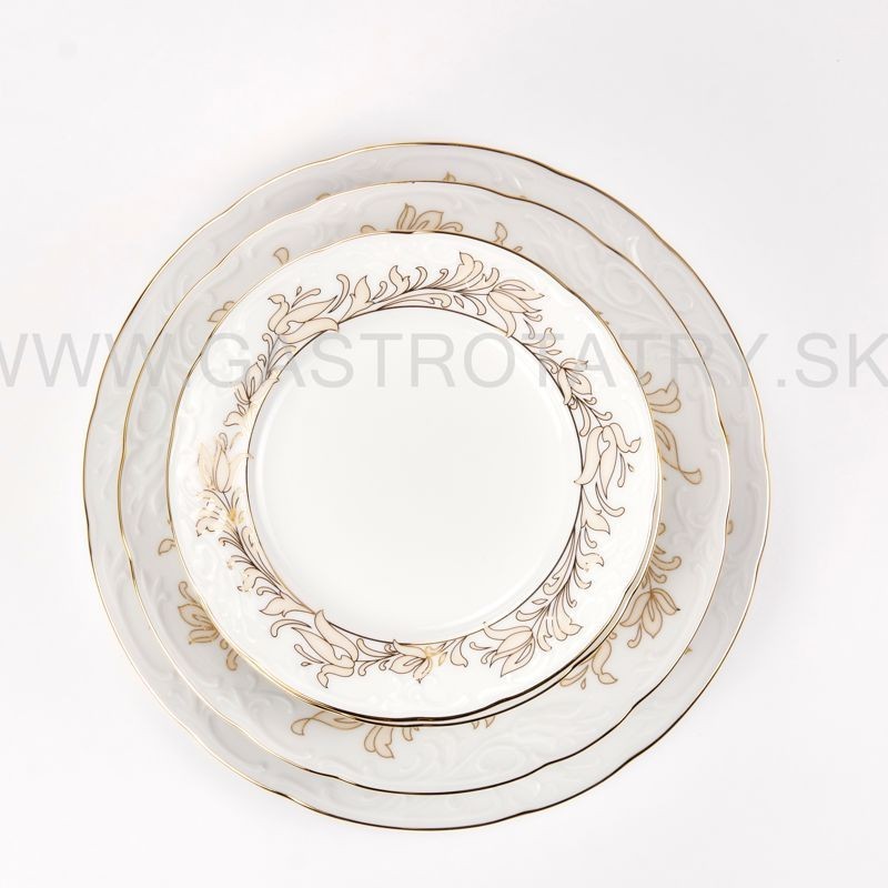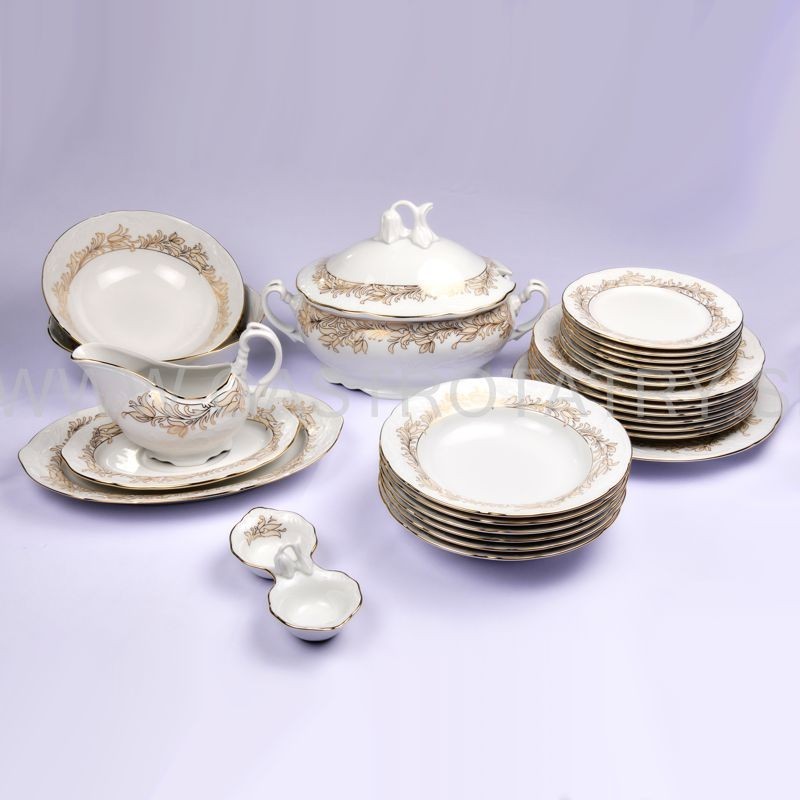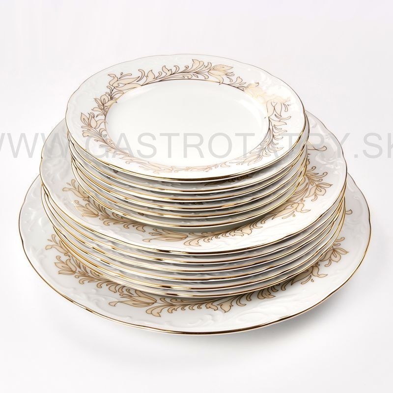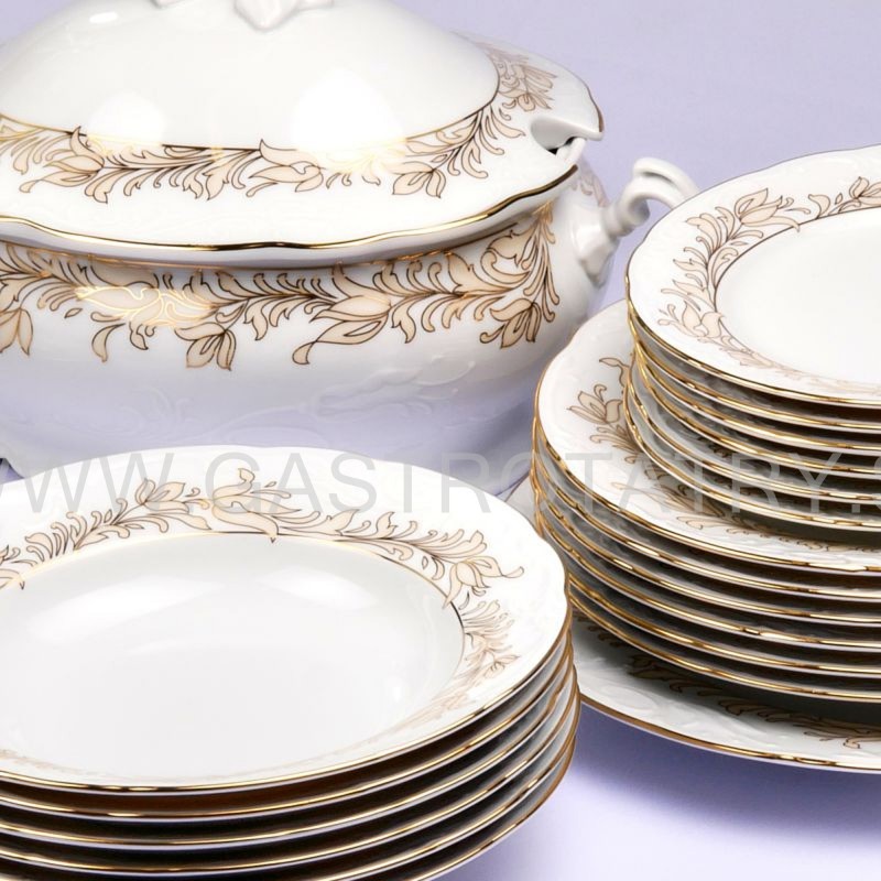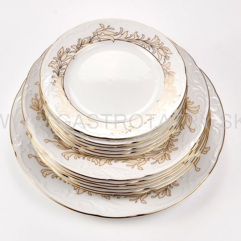 Obsahuje: 1 x misa polievková s pokrievkou 2,5 1 x omáčnik s tanierikom 400 ml, 1 x misa oválna 32 cm, 1 x misa okrúhla 30 cm, 6 x tanier plytký 25 cm, 6 x tanier hlboký 23 cm, 6 x tanier dezertný 19 cm, 1 x soľnička s koreničkou