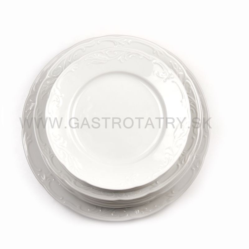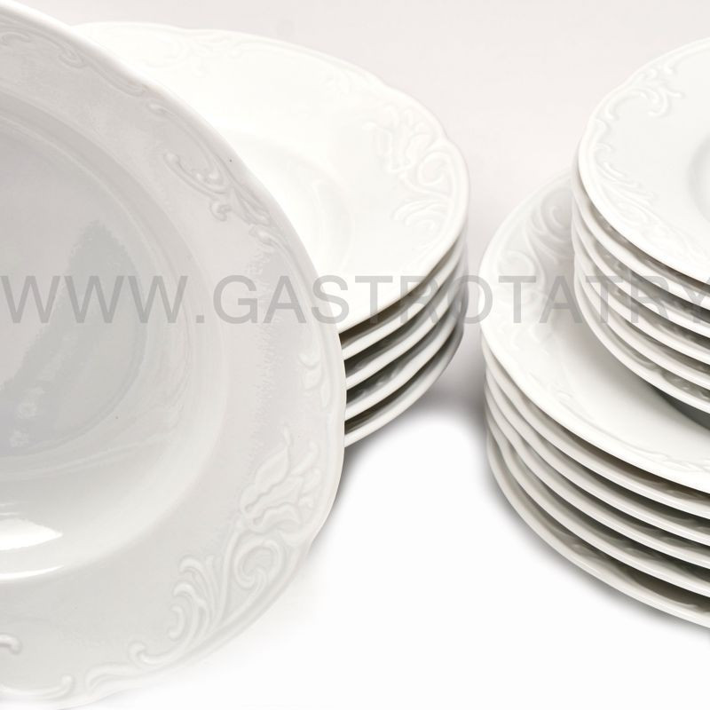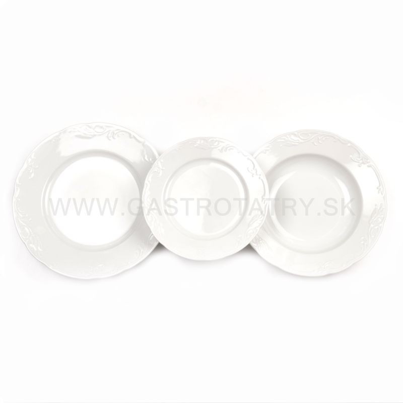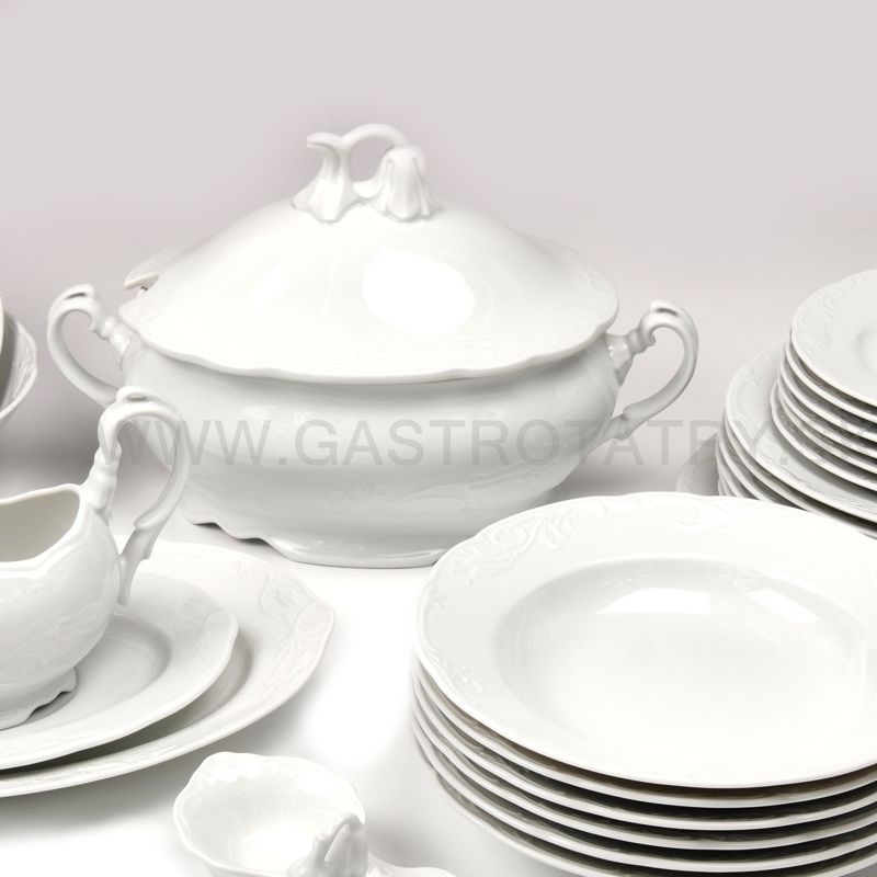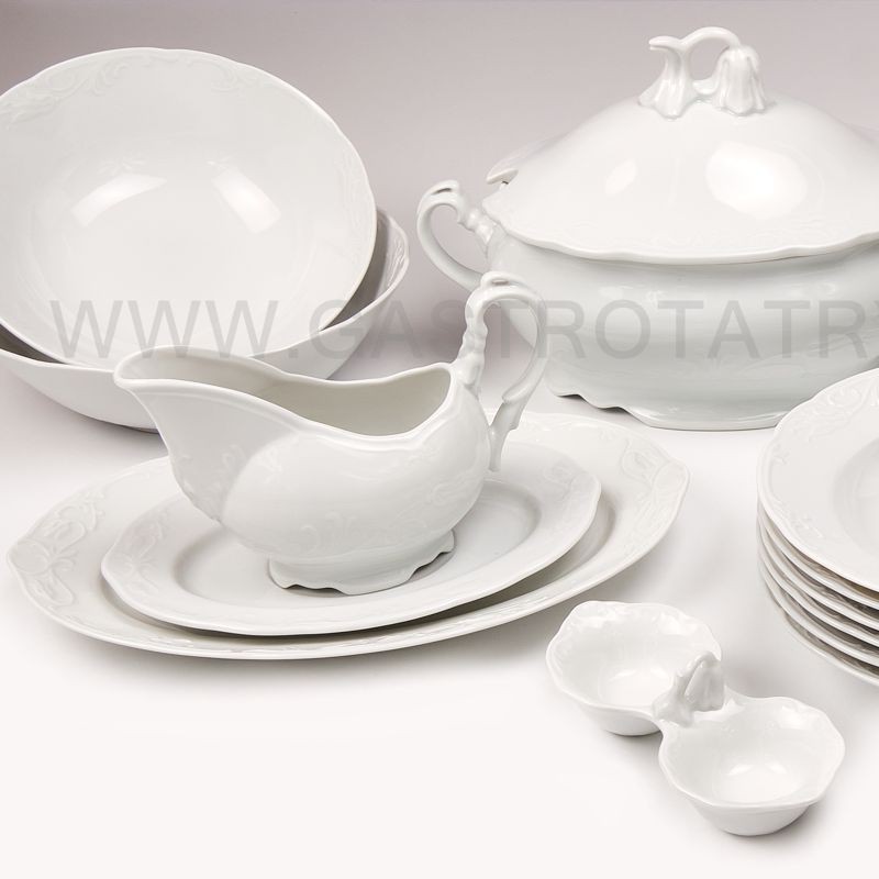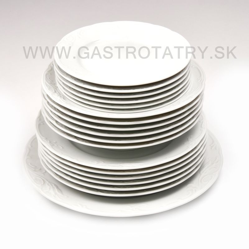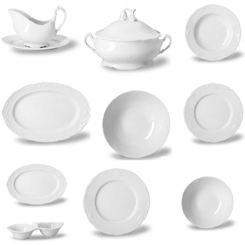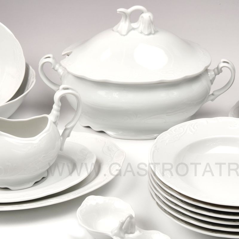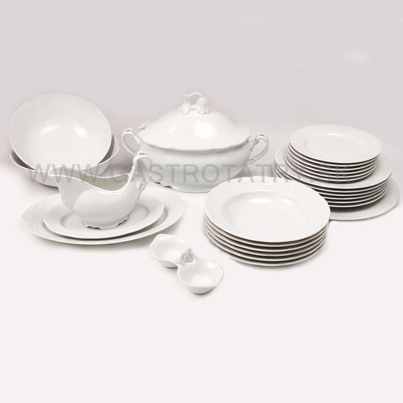 Obsahuje: 1 x misa polievková s pokrievkou 2,5 1 x omáčnik s tanierikom 400 ml, 1 x misa kompótová 25 cm, 1 x misa kompótová 23 cm, 1 x misa oválna 32 cm, 1 x misa okrúhla 30 cm, 6 x tanier plytký 25 cm, 6 x tanier hlboký 23 cm, 6 x tanier dezertný 19 cm, 1 x soľnička s koreničkou