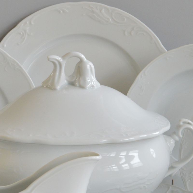 Karlovarský porcelán Tulip - biela, 27-dielna, reliéfny povrch, zvlnené okraje, precízne vypracovanie, výrazné ušká a úchytky. Obedová súprava je vhodná do mikrovlnej rúry a umývačky riadu.