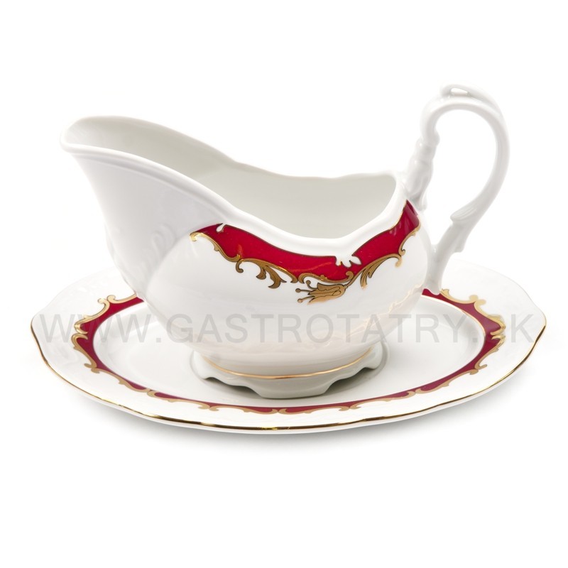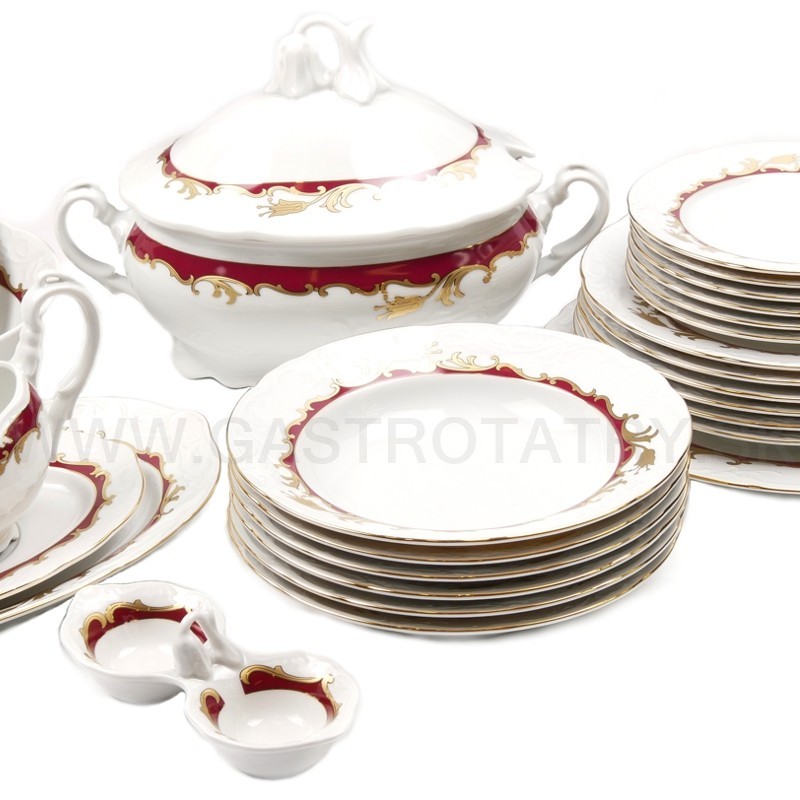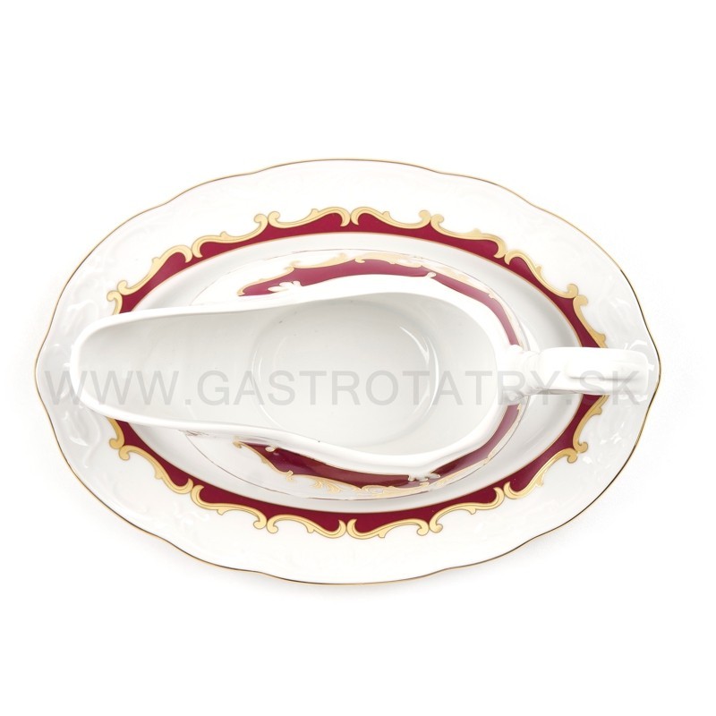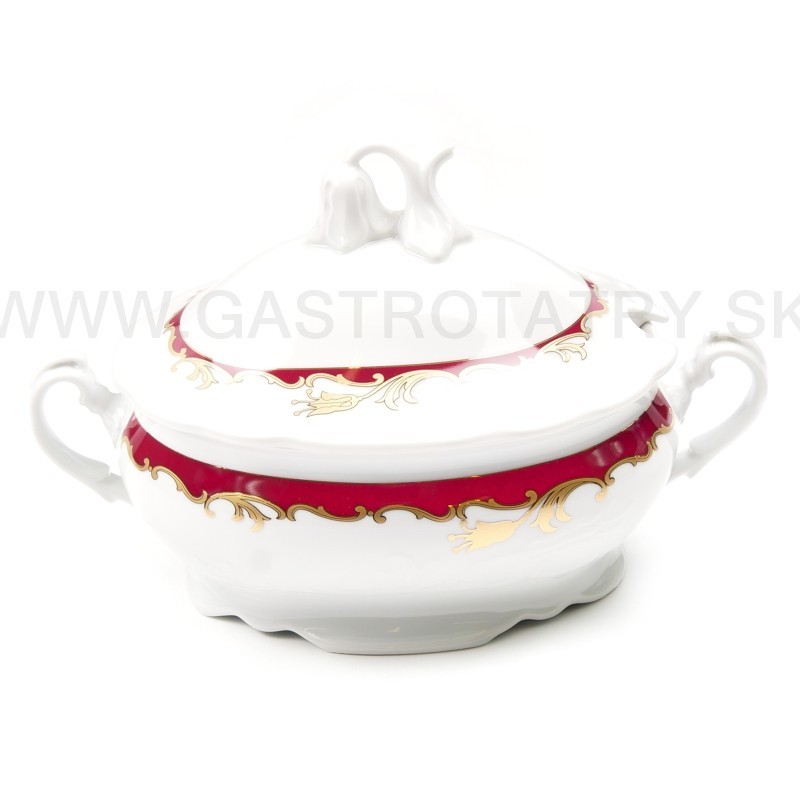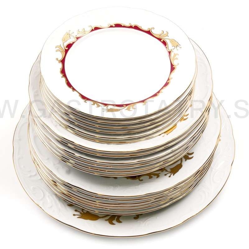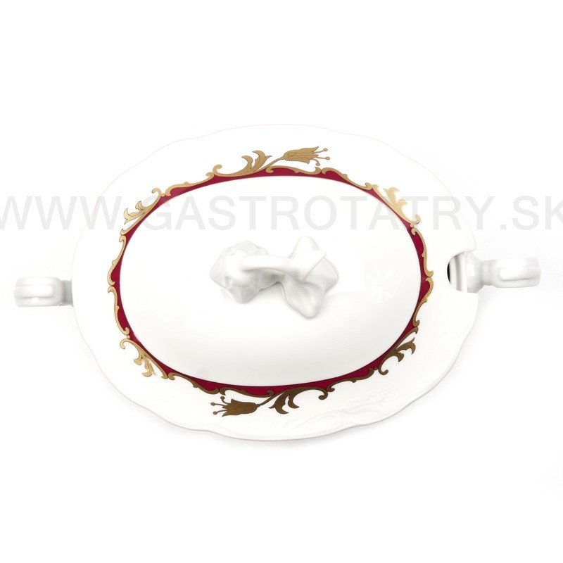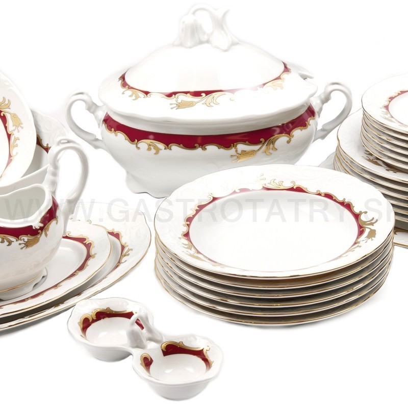 Karlovarský porcelán Tulip - výrazný zlatočervený ornament - zlatá linka, 26-dielna, reliéfny povrch, zvlnené okraje, precízne vypracovanie, výrazné ušká a úchytky. Obedová súprava nie je vhodná do mikrovlnej rúry a umývačky riadu.