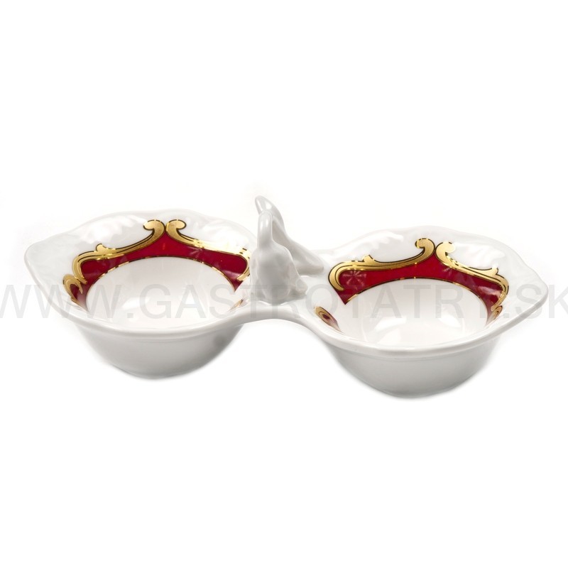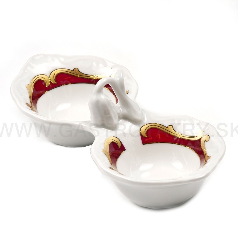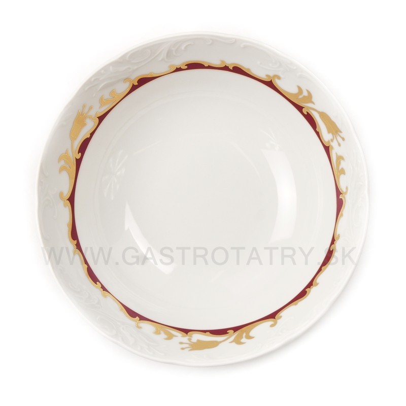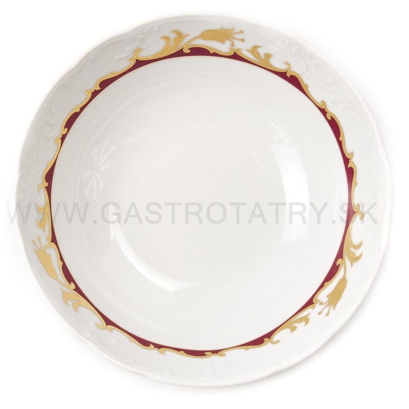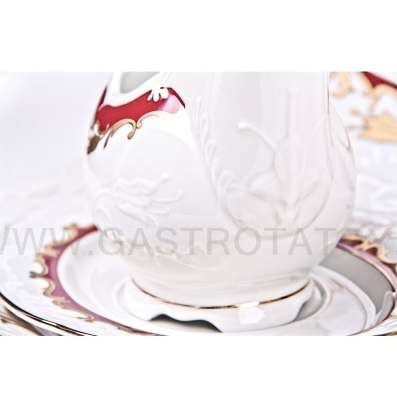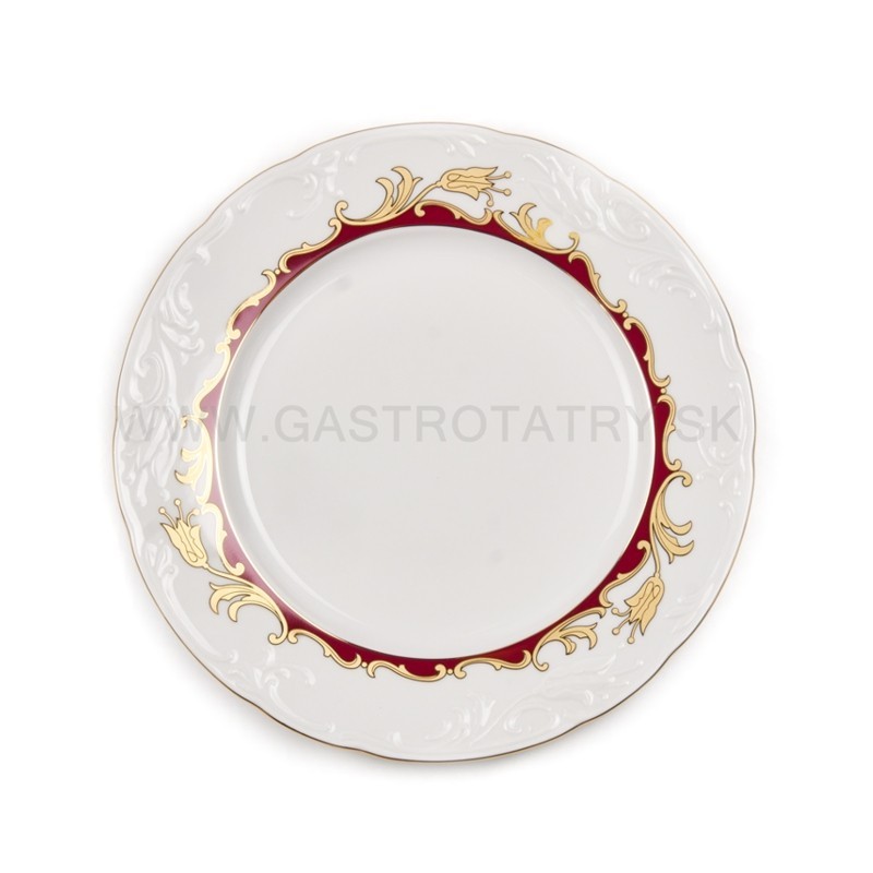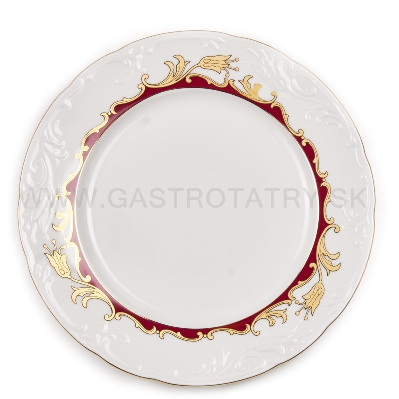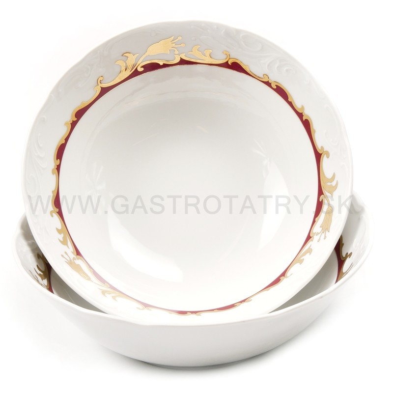 Karlovarský porcelán Tulip - výrazný zlatočervený ornament - zlatá linka, 26-dielna, reliéfny povrch, zvlnené okraje, precízne vypracovanie, výrazné ušká a úchytky. Obedová súprava nie je vhodná do mikrovlnej rúry a umývačky riadu.