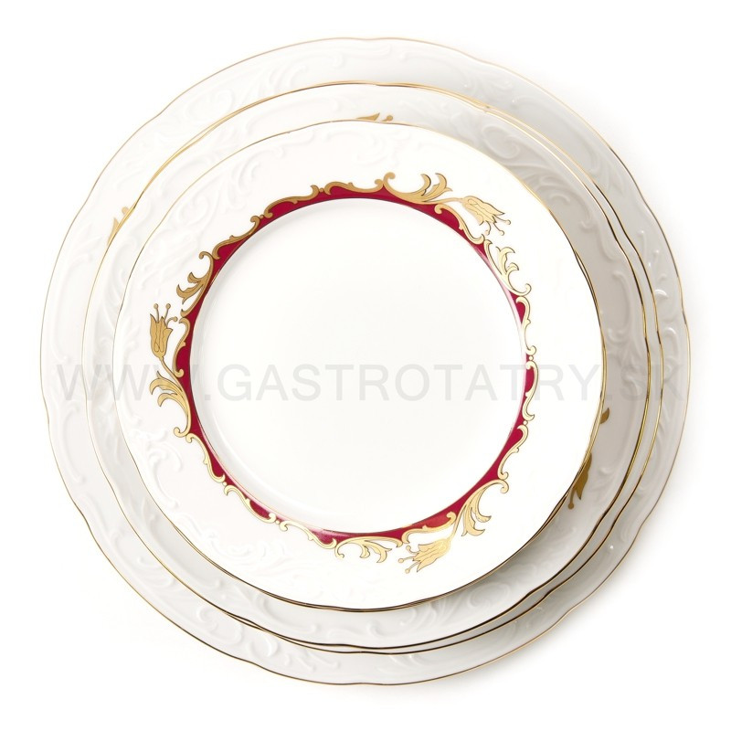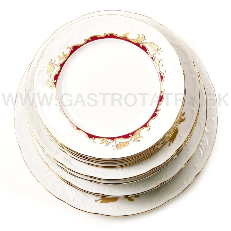 Karlovarský porcelán Tulip - výrazný zlatočervený ornament - zlatá linka, tanierová 18-dielna SP, reliéfny povrch, zvlnené okraje, precízne vypracovanie, výrazné ušká a úchytky. Tanierová súprava nie je vhodná do mikrovlnej rúry a umývačky riadu. Na objednavku dodanie 2 mesiace.