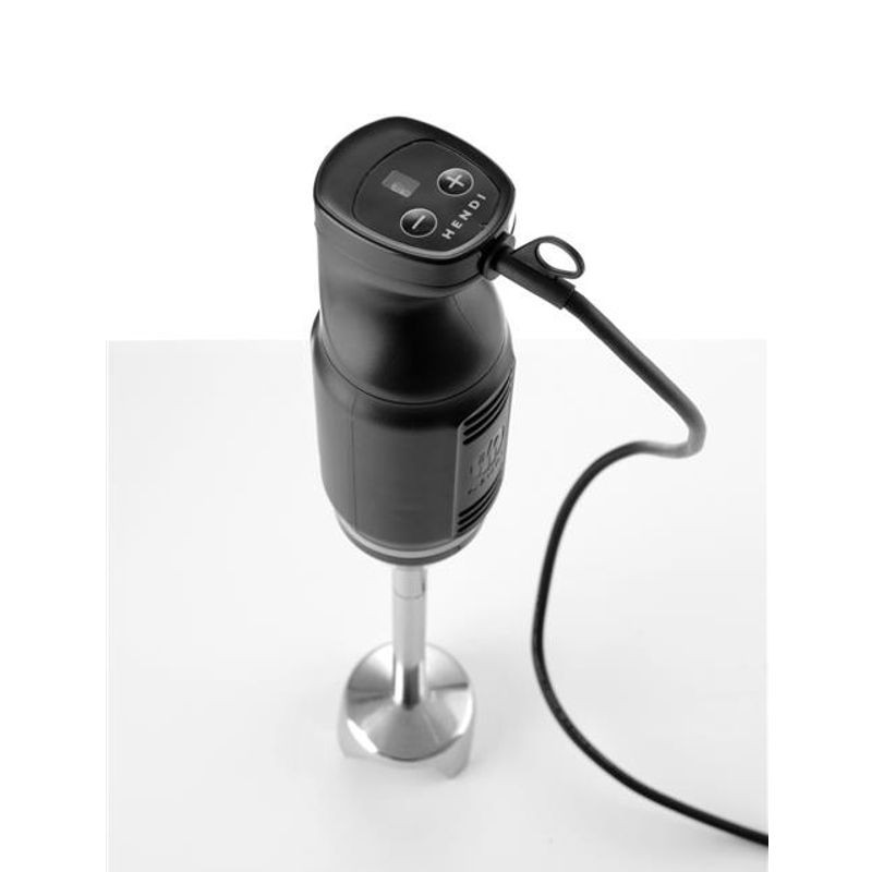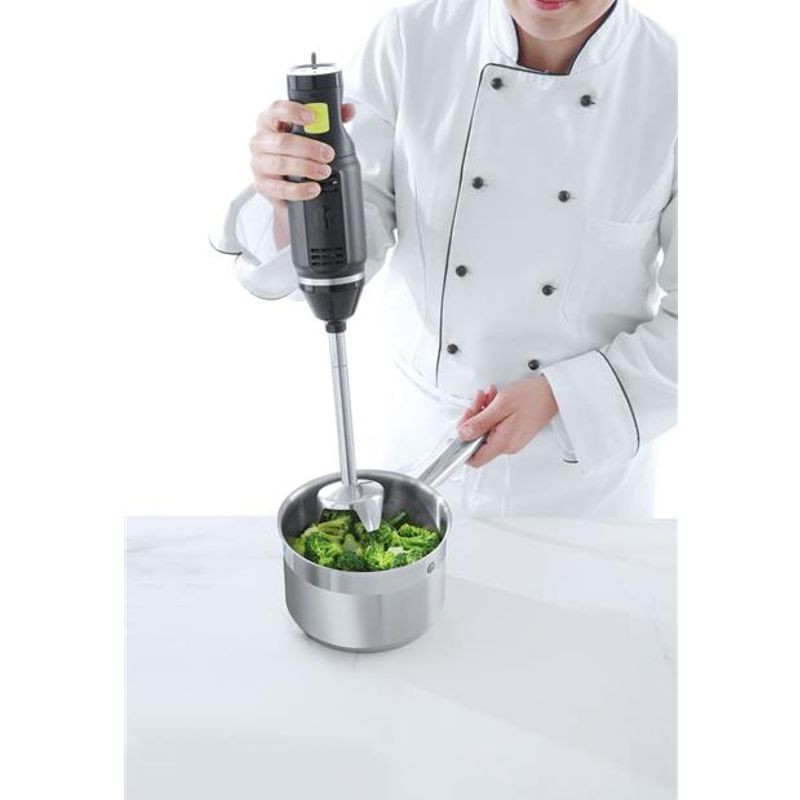 Ručný mixér BLEND, prípojka/ príkon 220-240V/250W, rozmery: ⌀71x(H)450 mm. Telo vyrobené z plastu ABS, rameno z nehrdzavejúcej ocele, dĺžka 200 mm. Priečna čepeľ z nehrdzavejúcej ocele s titánom. Výkonný motor 250 W, elektronický ovládací panel s LCD displejom – 6 rýchlostí. Maximálna rýchlosť 13500 ot./min. Vhodný na riad s objemom od 1 do 8 litrov.