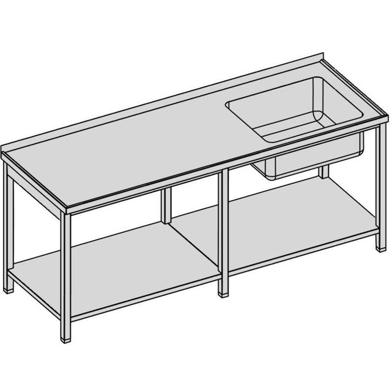 Umývací stôl s vaňou a policou dlhý, hĺbka 700 -800 mm, šírka 2000 - 2800 mm, výška V=850 mm (-10/+25 mm), zadný lem 40 mm, zadné nohy odsadené 25 mm, lisovaná vaňa - 600x600x300 mm, polica vo výške 150 mm, nosnosť police 50 kg/1 polica, možné úpravy