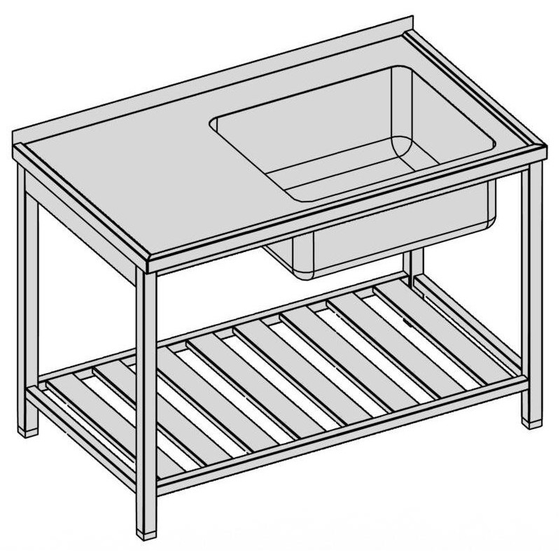 Umývací stôl s vaňou a roštovou policou, hĺbka 700 - 800 mm, šírka 1000 - 1900 mm, výška V=850 mm (-10/+25 mm), zadný lem 40 mm, zadné nohy odsadené 25 mm, lisovaná vaňa - 600x600x300 mm, roštová polica vo výške 150 mm, nosnosť police 50 kg/1 polica, možné úpravy