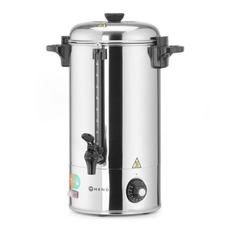 Varič na víno a vodu, objem 9 l, z vysoko lešteného nerezu, rozsah termoregulácie: 30°C až 100°C, s bezpečnostným termostatom, s ukazovateľom úrovne vody v nádržke, špirály mimo varný priestor. Priemer 22,7 cm, výška 46,8 cm, prípojka 230 V, príkon 2,2 kW, regulácia teploty 30-100°C, hladinoznak, výhrevné teleso mimo varný priestor, hmotnosť 4 kg
