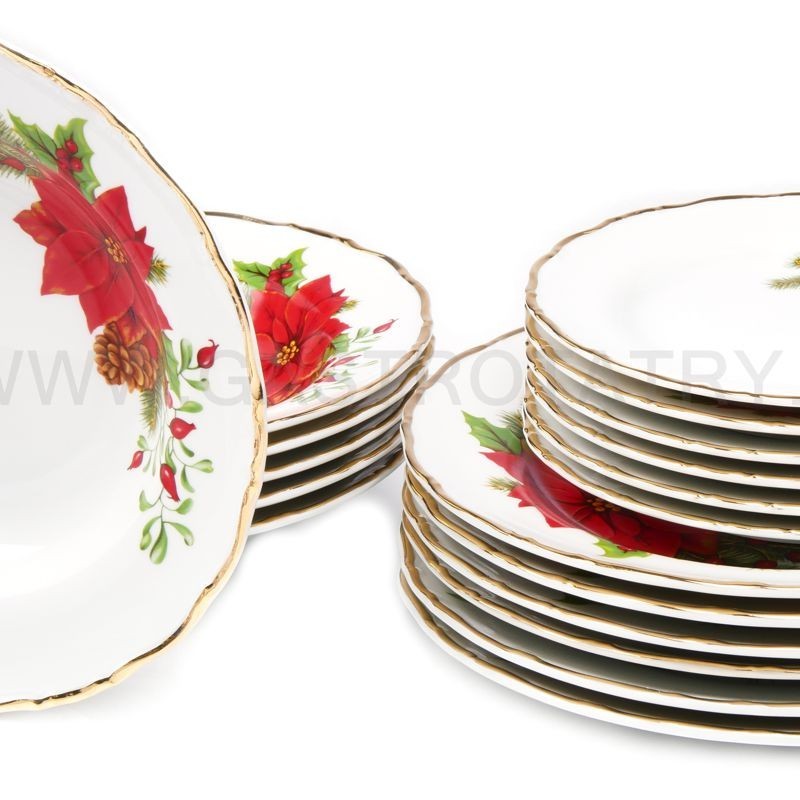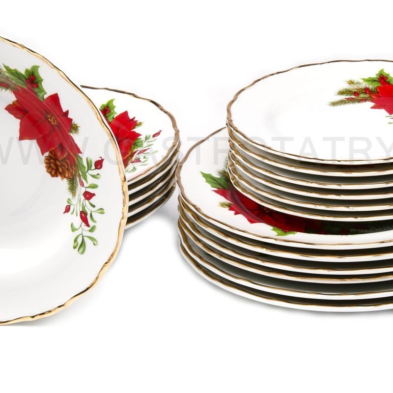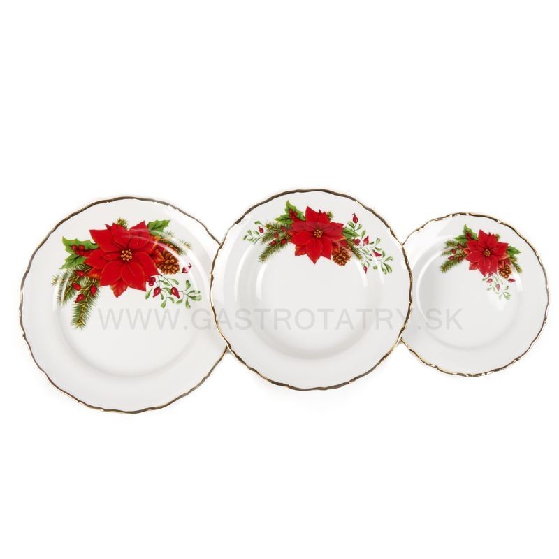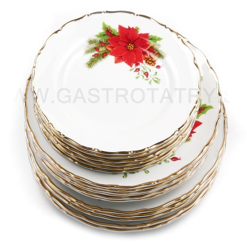 Motív červenej vianočnej hviezdy s typickou vianočnou dekoráciou smrekovej vetvičky a cezmíny na porcelánovom tanieri Ophelia je orámovaný zlatým okrajom. Je možné do tanierového setu doplniť Tanier plytký 25 cm, Tanier Hlboký 23cm , Tanierovú súpravu 18D, etažérku a hrnček Tomáš v rovnakom dekore.
