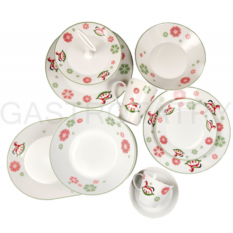 Vianočná porcelánová kolekcia Koník Vás prenesie v spomienkach späť do detstva a nastolí tú správnu pohodovú vianočnú atmosféru. Tanierovú súpravu môžete kombinovať s KOMPÓTOVOU MISOU 24CM, ETAŽÉRKOU, ŠÁLKOU S PODŠÁLKOU ŠAPÓ, VIANOČNOU OVÁLNOU MISOU a VIANOČNÝM HRNČEKOM rovnakého dekoru a máte výzdobu na celý advent Klasické vianočné farby – zelená a červená – klasika, ktorá nikdy neomrzí. Možno použiť v mikrovlnnej rúre aj umývačke riadu. Thun1794.