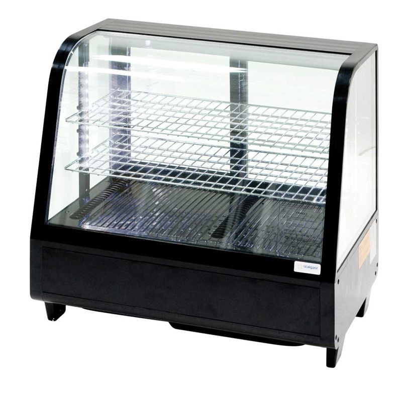 Stolová chladiaca vitrína - čierna ▪ termoizolačné sklo zo štyroch strán ▪ s LED osvetlením ▪ telo z čierneho plastu ▪ vzadu s posuvnými dverami ▪ 2ks nastaviteľných roštov ▪ objem: 100 l ▪ cirkulačné chladenie: +2°C ~ +12°C ▪ manuálny termostat, rozmery: 682 x 450 x 675 mm, prípojka 230 V, príkon 0,16 kW