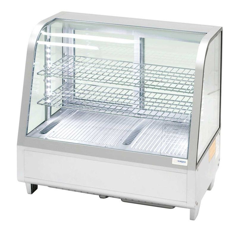Stolová chladiaca vitrína - strieborná ▪ termoizolačné sklo zo štyroch strán ▪ s LED osvetlením ▪ telo zo strieborného plastu ▪ vzadu s posuvnými dverami ▪ 2ks nastaviteľných roštov ▪ objem: 100 l ▪ cirkulačné chladenie: +2°C ~ +12°C ▪ manuálny termostat, rozmery: 682 x 450 x 675 mm, prípojka 230 V, príkon: 0,16 kW