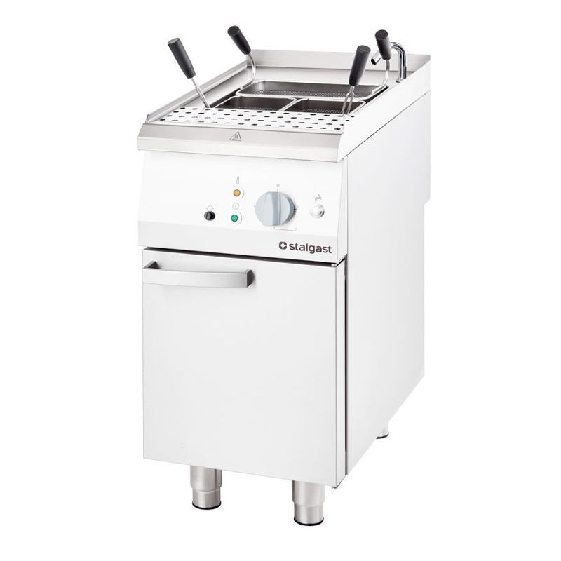 Elektrický varič cestovín Stalgast ▪ kapacita 2x 1/3 kôš alebo 4x 1/6 kôš (alebo kombinácia) ▪ s elektrickým napúšťacím ventilom ▪ s bezpečnostným termostatom ▪ nerezová špirála umiestnená vo vani ▪ bez komína (možné dokúpiť) ▪ s prepadom ▪ cena bez košov. Prípojka 400 V, príkon 6 kW, objem 25 l, rozmery 400 x 700 x 850 mm
