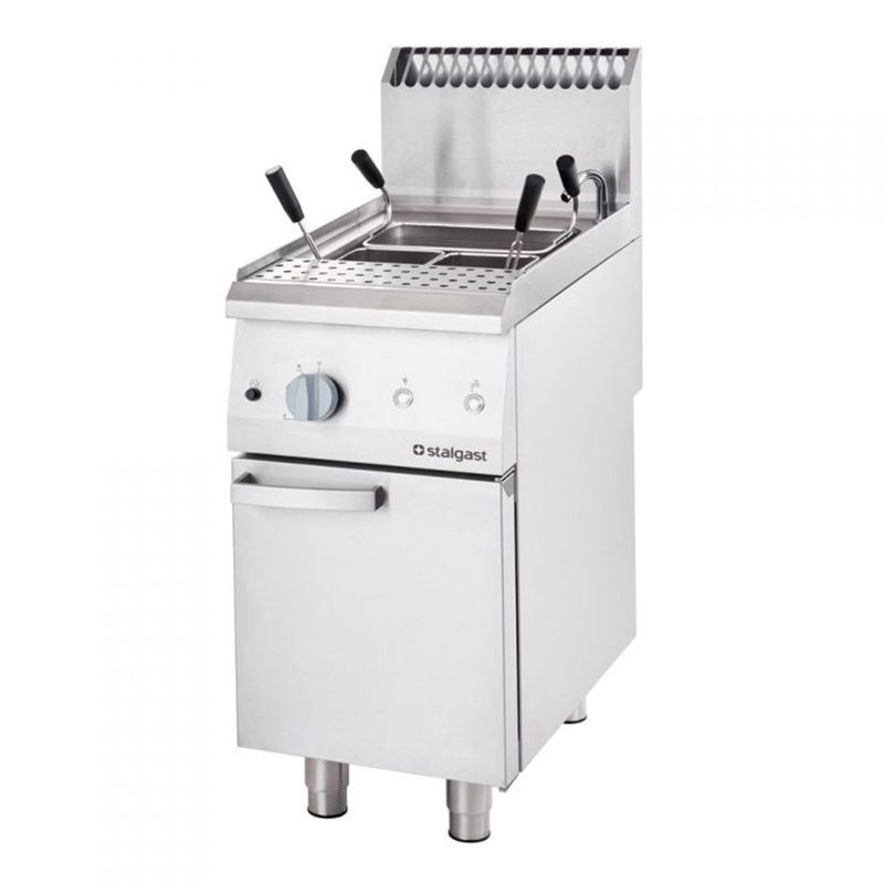 Plynový varič cestovín Stalgast ▪ kapacita 2x 1/3 kôš alebo 4x 1/6 kôš (alebo kombinácia) ▪ s elektrickým napúšťacím ventilom ▪ s bezpečnostným termostatom ▪ nepriamy ohrev ▪ na zemný plyn (možné objednať na propán-bután) ▪ s prepadom ▪ cena bez košov ▪ s elektrickým zapaľovaním (potrebuje prípojku 230V). Výkon plyn 9,1 kW, prípojka plyn G20, objem 25 l, rozmery 400 x 700 x 850 mm