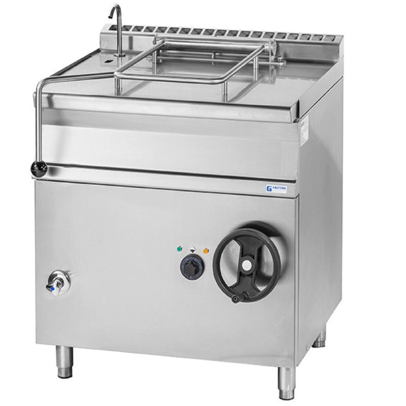 Elektrická výklopná panvica, objem 80 l ▪ s nerezovou panvicou ▪ dostupné aj s oceľovým dnom ▪ objem 80 litrov ▪ manuálne vyklápanie ▪ s napúšťacou batériou ▪ kompletne z nerezu ▪ s elektrickým zapaľovaním. Prípojka 400 V, príkon 12 kW, rozmery 800 x 900 x 900 mm