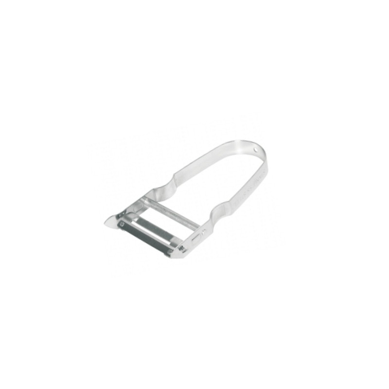 Škrabka na zemiaky, dĺžka 110 mm , dlžka čepele 50 mm, dĺžka rukoväte 60 mm. Čepeľ vyrobená z nehrdzavejúcej ocele. Rukoväť vyrobená z PP (polypropylénu). K dispozícii v 3 farbách: čiernej, červenej, zelenej. Vhodné do umývačky riadu. Priečny model.