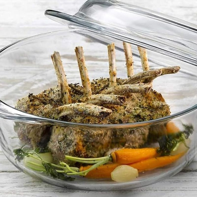 Pekáč okrúhly Borcam, rozmery: dĺžka 25,1 x šírka 22 cm, výška 8 cm + 3,8 cm, objem: misa 2,2 l + veko 0,96 l. Vhodný do umývačky riadu.