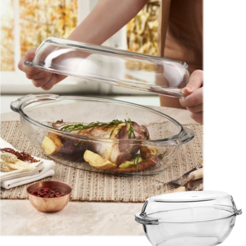 Zapekacia misa Borcam oválna, rozmery: 34 x 19 5 cm, výška 9 cm x 5,5 cm, objem misa 2,85 l + veko 1,8 l, vhodná do umývačky riadu