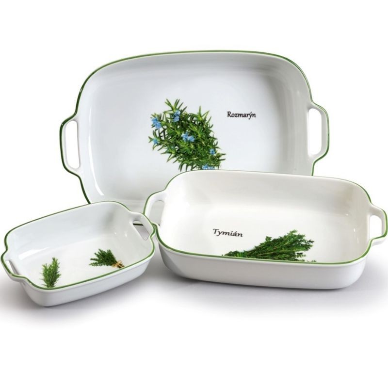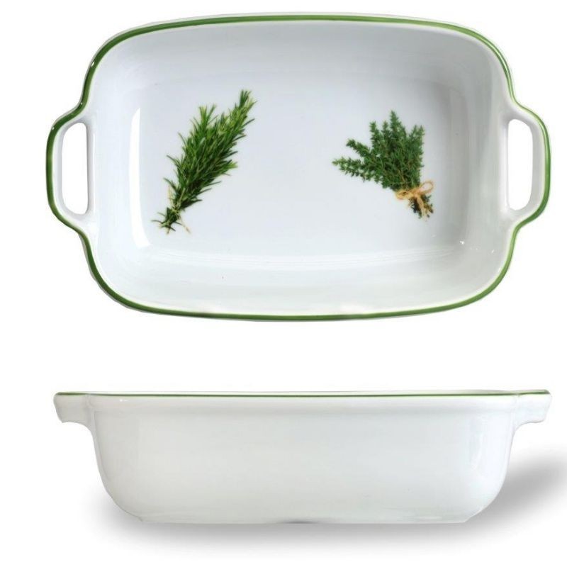 Zapekacia misa malá s ušami - bylinky, je vhodná do mikrovlnnej rúry a umývačky riadu. Rozmery: výška: 55 mm, objem: 400 ml, dĺžka: 218 mm, šírka: 130 mm. Karlovarský porcelán THUN 1794.