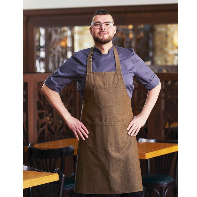 Zástera LIVIANO. Táto zástera stelesňuje trendový rustikálny štýl. Má jedno veľké vrecko na hrudi a veľké dvojvrecko v strede. Výšku možno nastovovať pomocou karabínky na traku. Je možné ju brandovať výšivkou a potlačou. Výšivka je za príplatok 4,70 € bez DPH